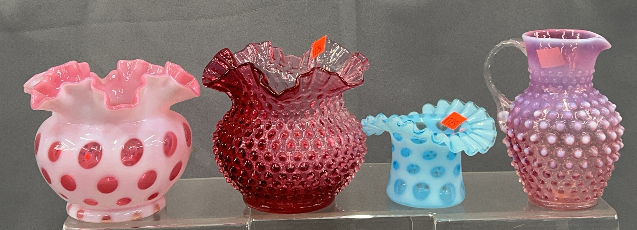 Cranberry Opalescent Coin Dot, Aqua Coin Dot and Other Hobnail, Tallest Ruffle Edge Vase 6x5.5"
