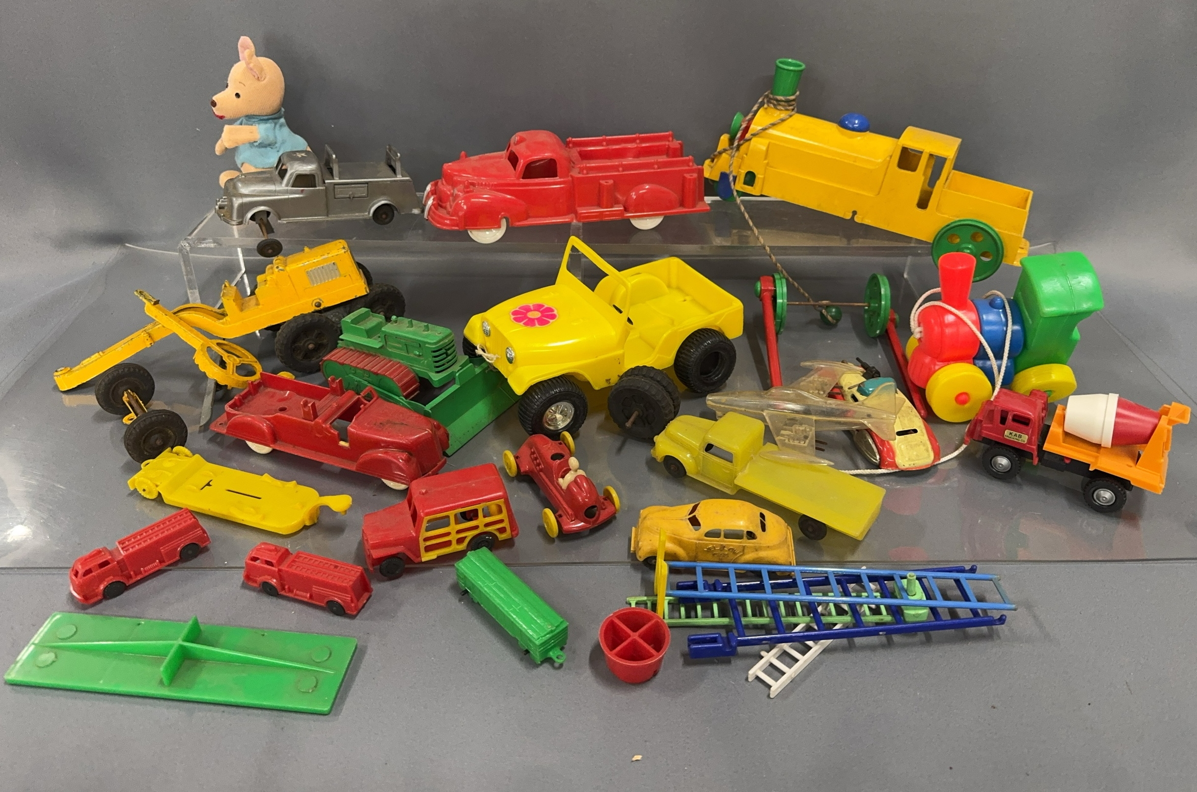 Assorted Plastic and Metal Children's Toy Cars, Trucks, Parts - 11" of largest - some wear/damage