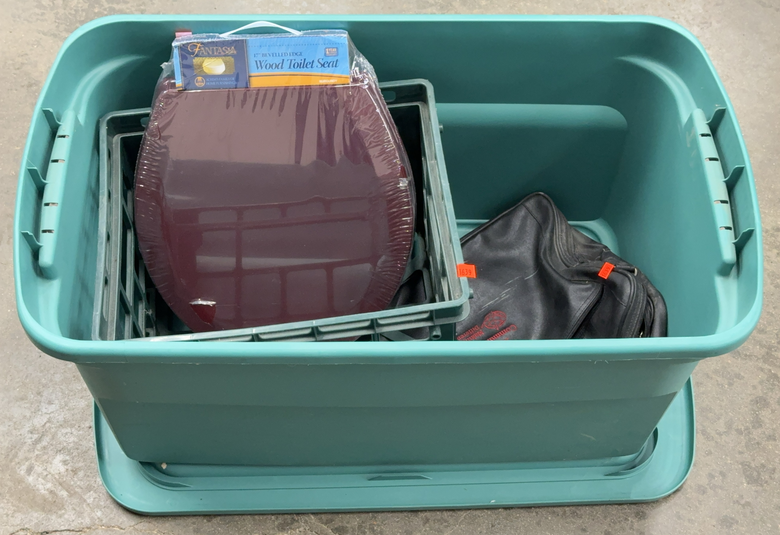 Wood Toilet Seat, Large Storage Tote, Work Bag, Plastic Crate - 17" of toilet seat