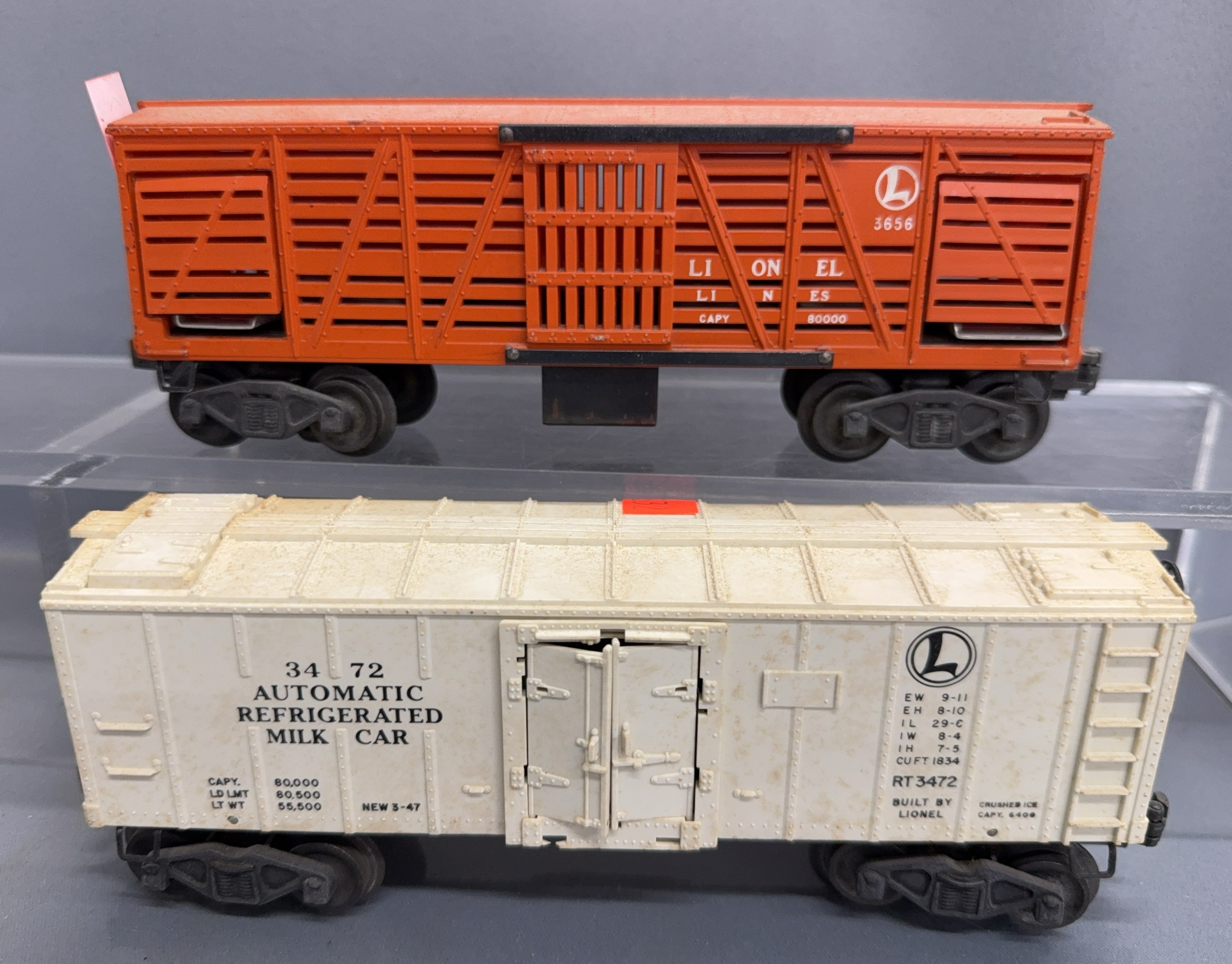 2 Lionel Model Train Milk Car and Stock Car - 8" of each