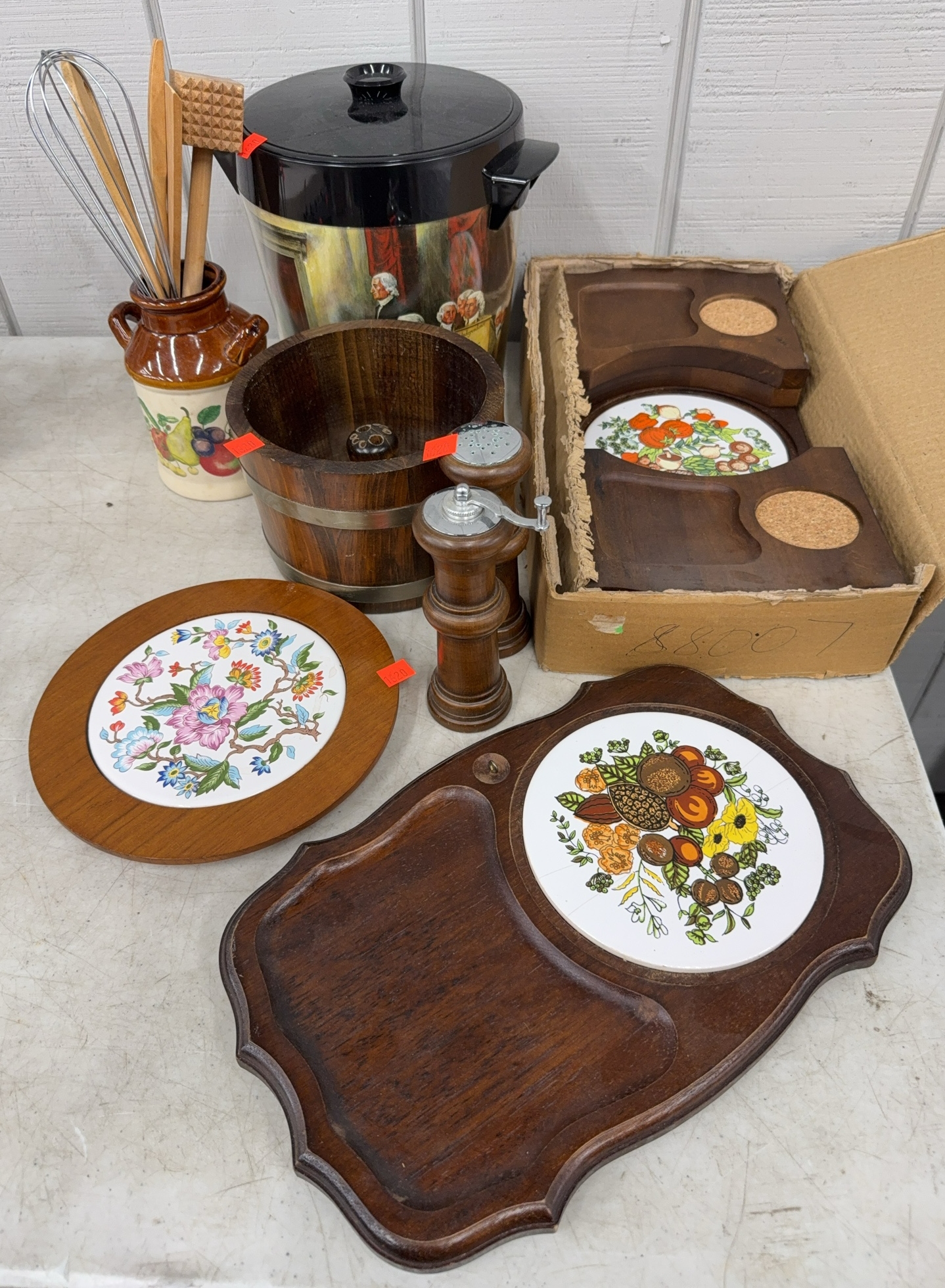 Assorted Kitchenware - Ice Bucket, Utensils, Trivets, Salt and Pepper Mill, Appetizer Board, Nut Bowl - 10" x 10" of ice bucket
