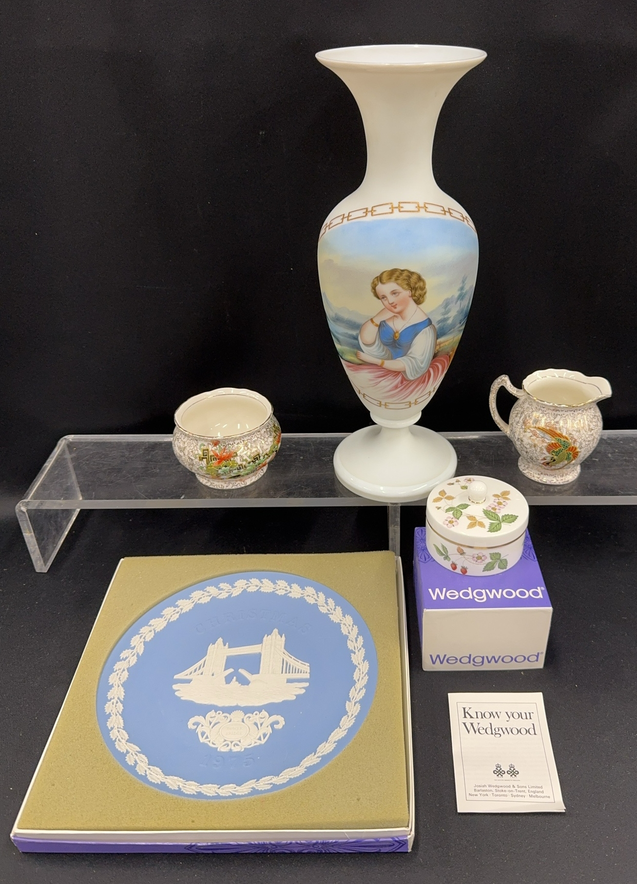 Portrait Printed Glass Vase, Wedgwood Collector Plate and Lidded Dish, Phoenix Ware Cream and Sugar - 13" of vase