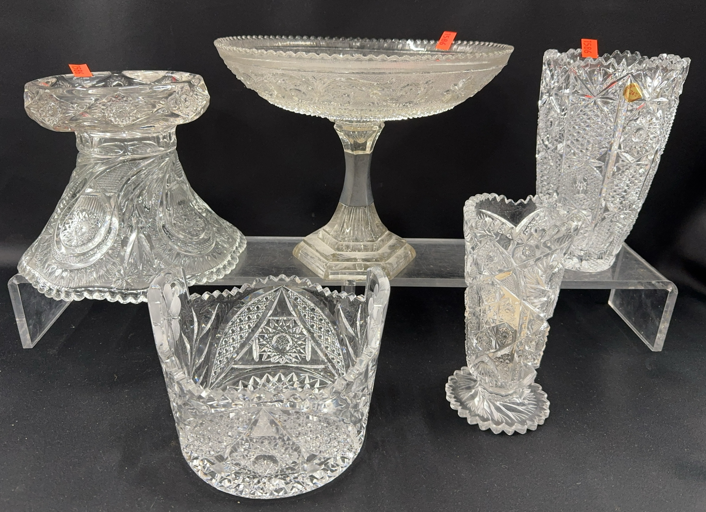 Cut Glass Ice Bucket and Pressed Glass Punch Bowl Base, Compote, Vases - 10" x 9" of compote