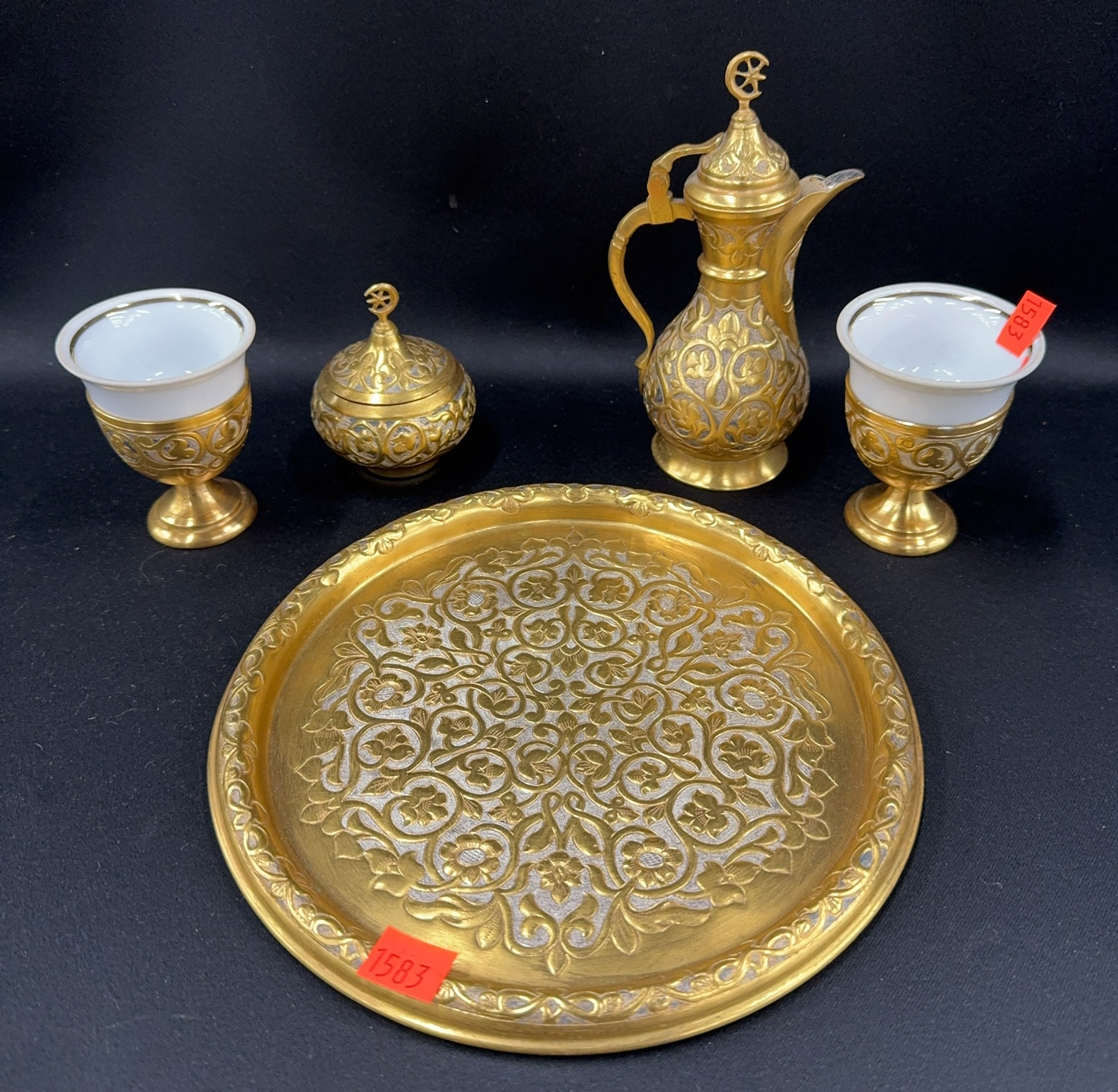 Yugoslavian Embossed Gilt Tone Metal Coffee Set - 8" D of tray