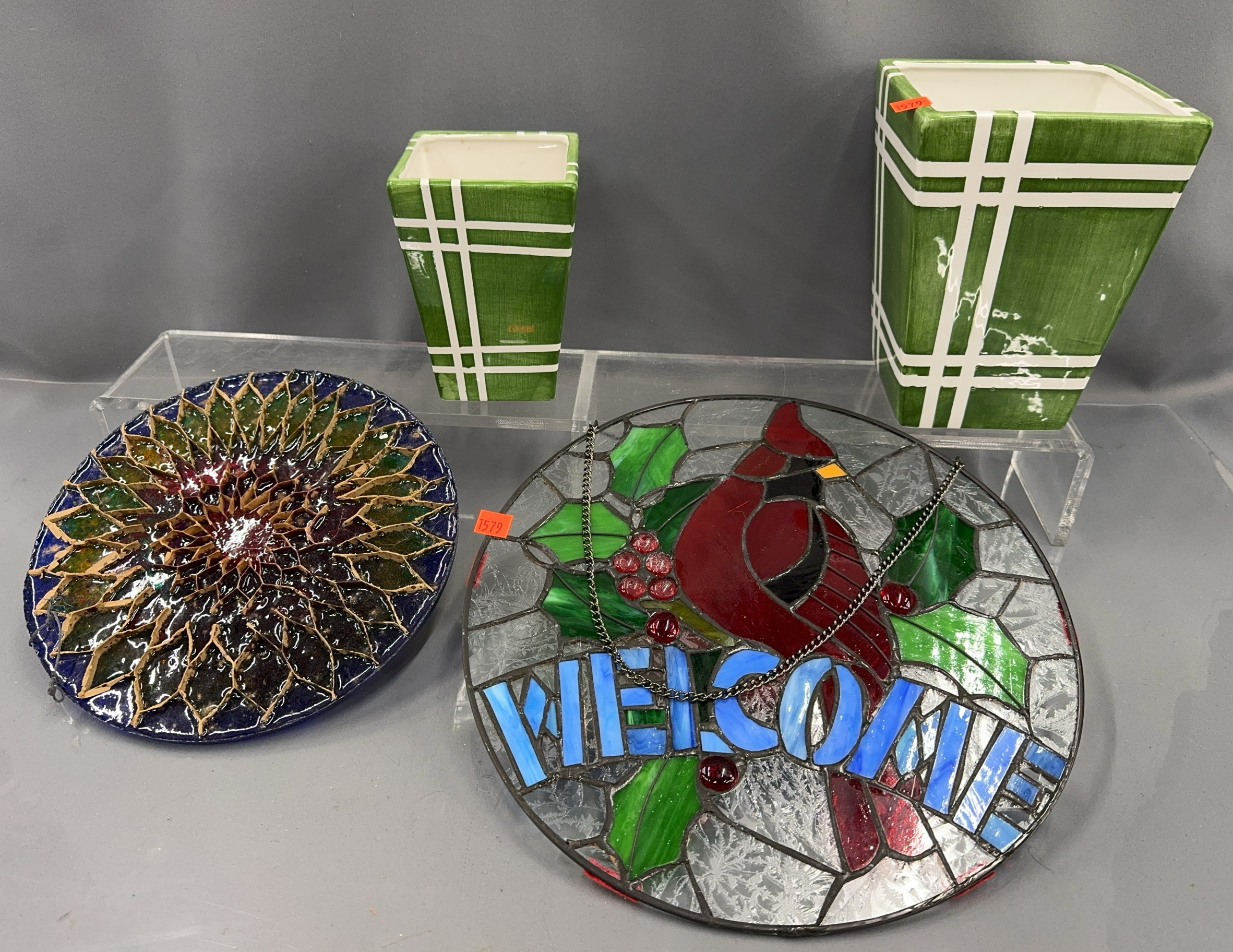 13" Cardinal Welcome Stained Glass Suncatcher, 2 Ceramic Vases, Homemade Suncatcher