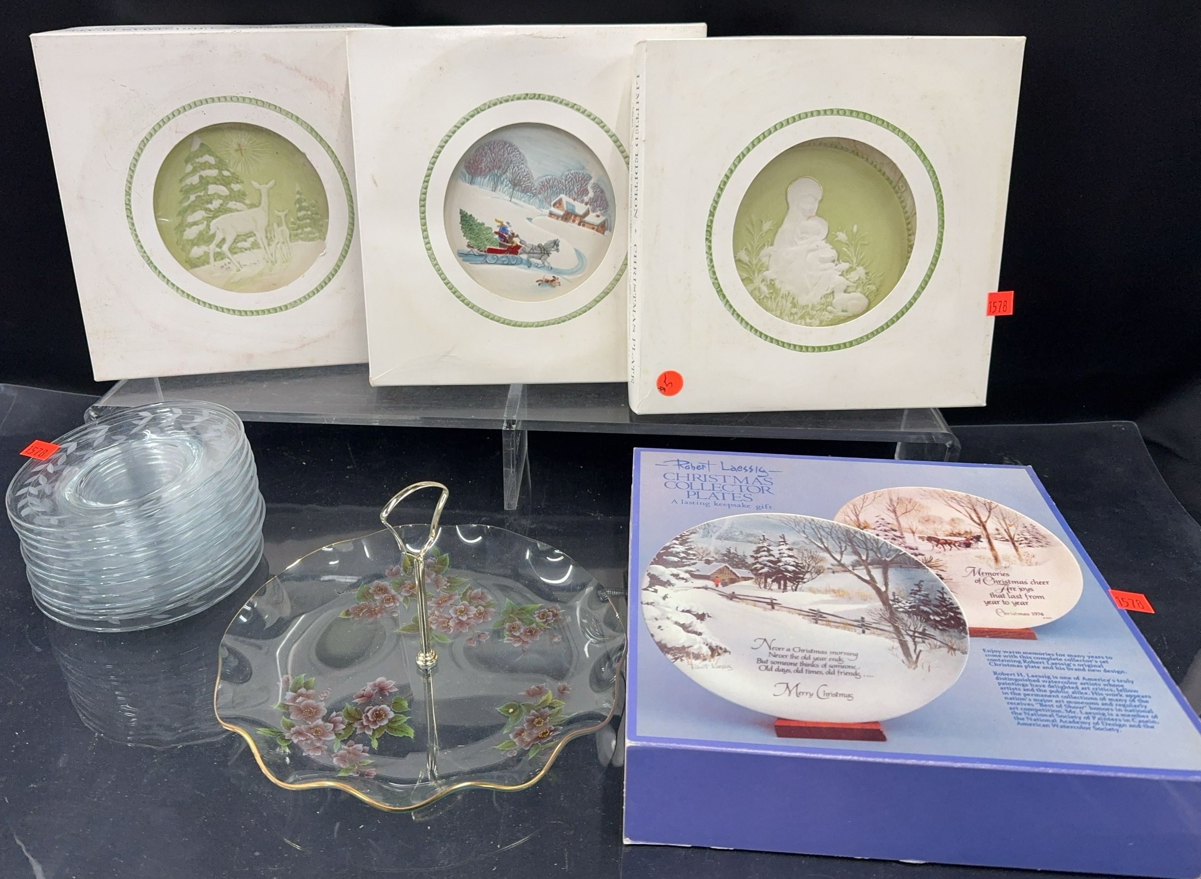 Vernonware and Robert Laessig Winter Collector Plates, Etched Glass Saucers, Floral Glass Tid Bit Tray - 9" approx of largest