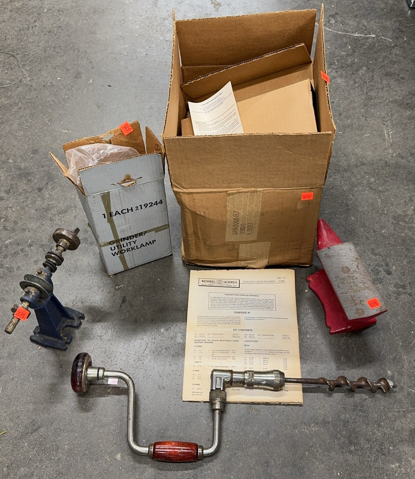 Heathkit Chassis Parts, Small Anvil, Grinder Worklamp, Hand Drill - 23" of drill