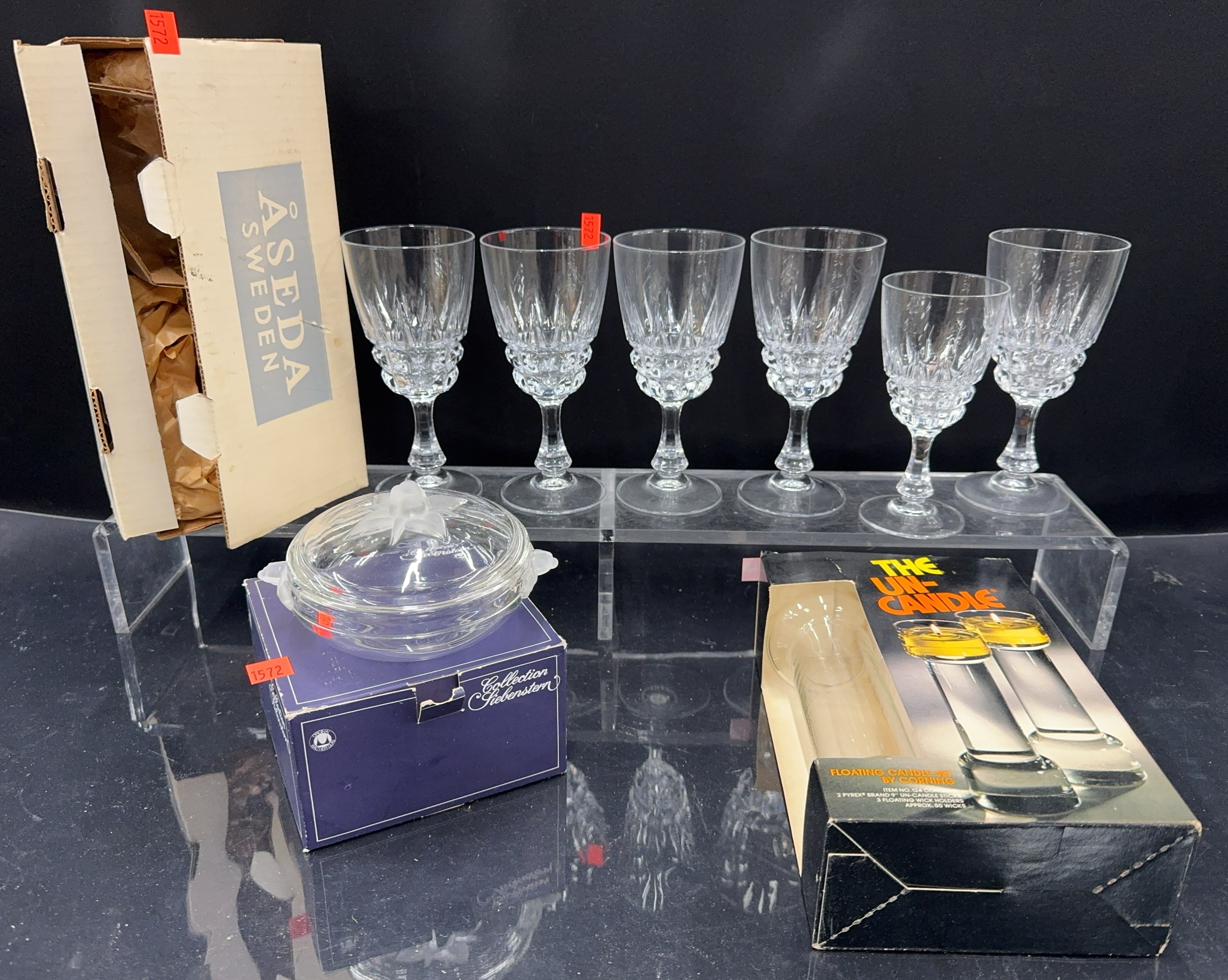 Cristal d Arques Pompadour Crystal Stems, Un-Candle Floating Candle Set Corning, Walther Glas Lidded Dish, Aseda Vase - 10" of tallest
