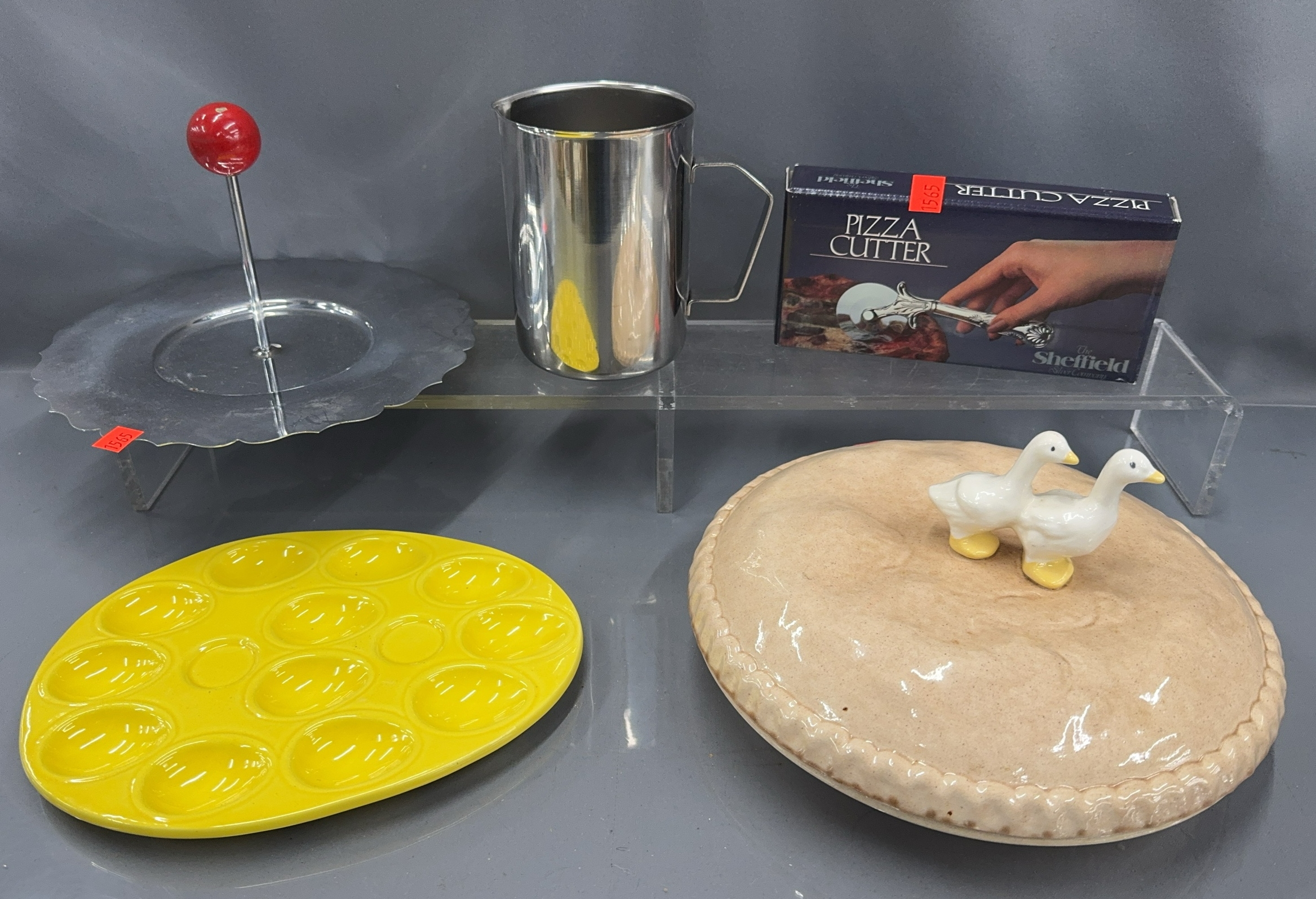 Duck Covered Pie Plate, Egg Plate, Pizza Cutter, Tidbit Tray, Stainless Frother - 10" D of pie plate