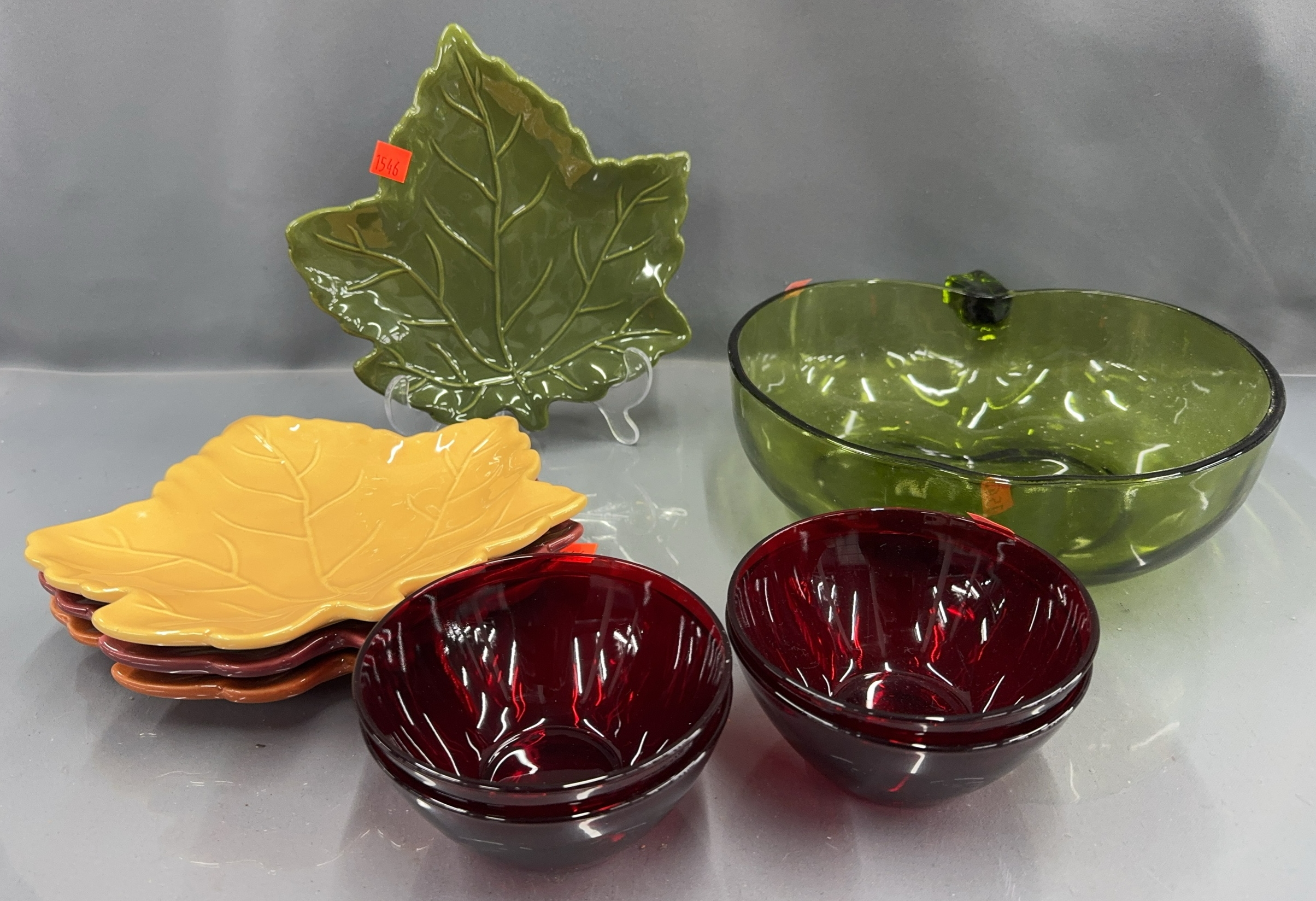 4 Leaf Motif Plates, Green Glass Apple Bowl, Red Glass Bowls - 10" D of bowl