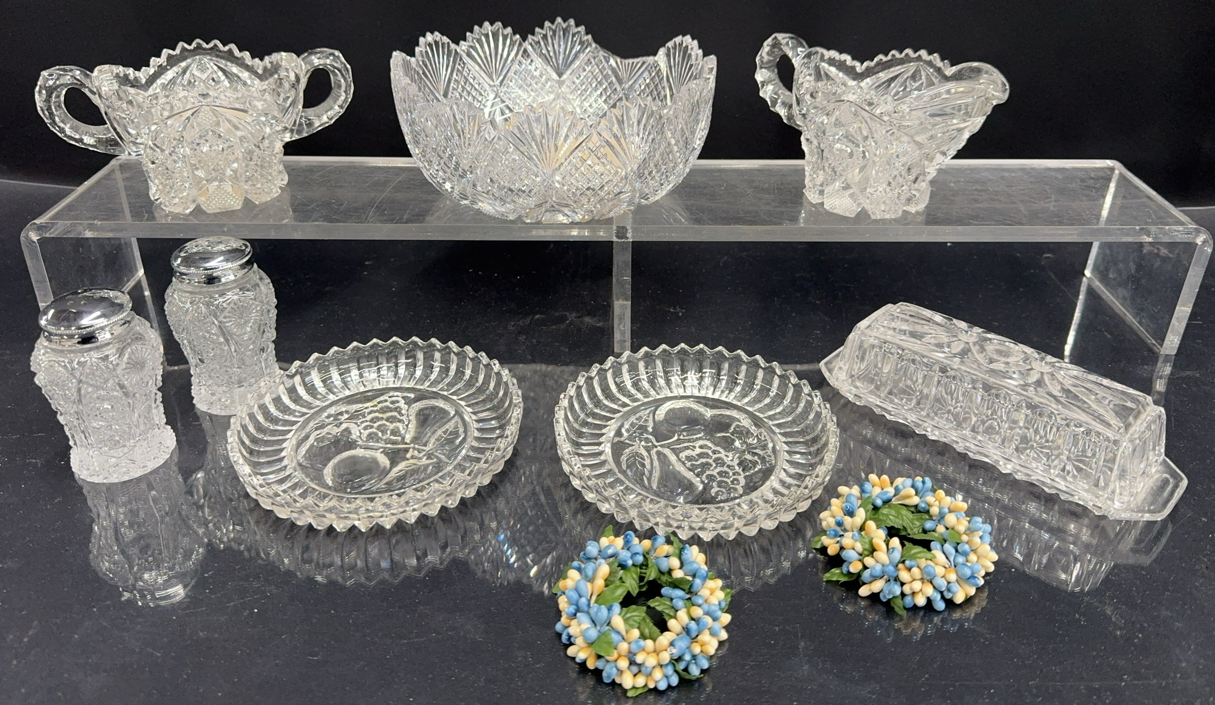 Pressed Glass Sugar and Creamer, Butter Holder, Salt and Pepper, Lidded Dish, Cut Glass Bowl (Damaged) - 7" D of largest