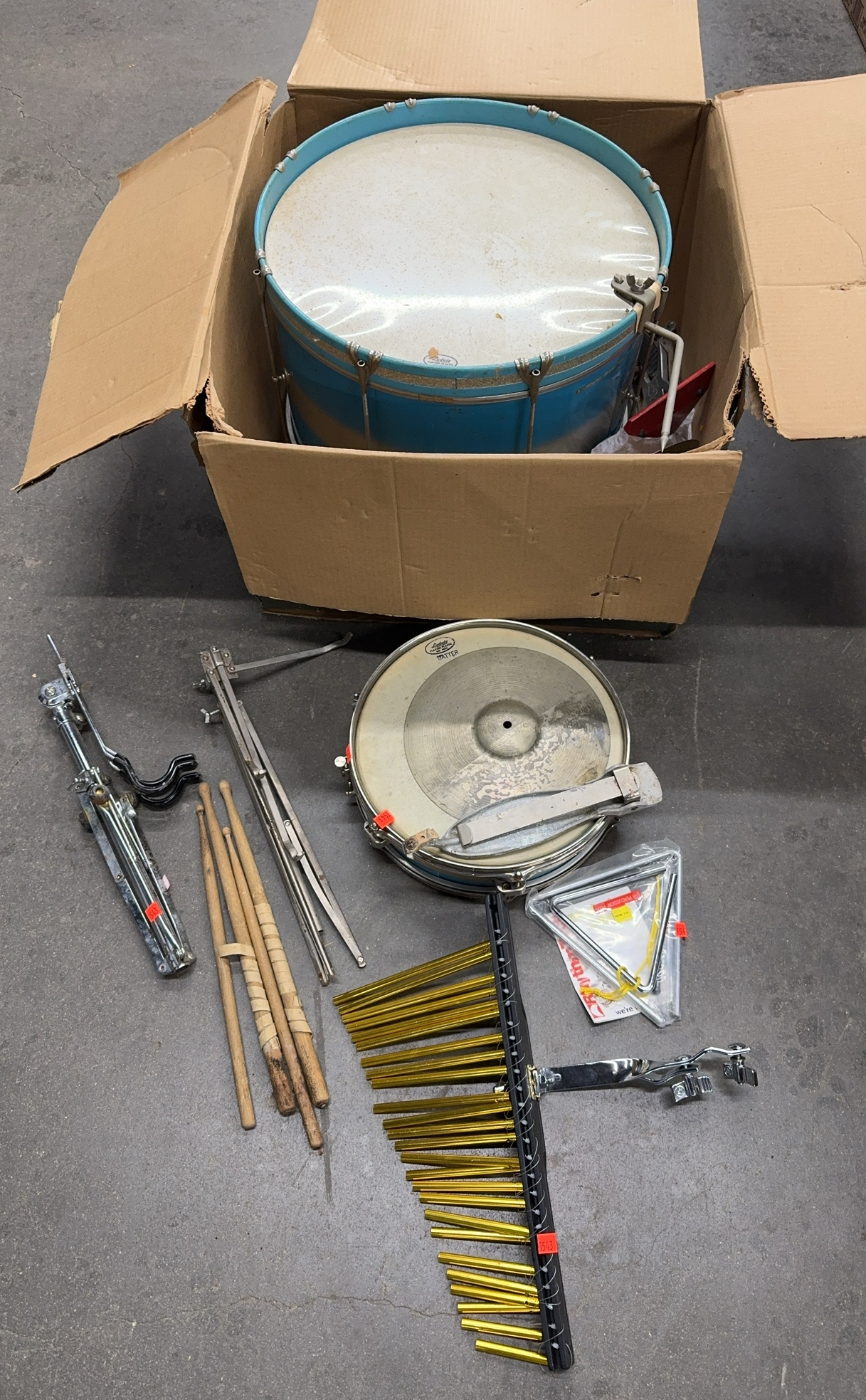 Ludwig Bass and Snare Drum, Bar Chimes, Drum Sticks - Wear from use and storage - 21" x 15" of bass drum
