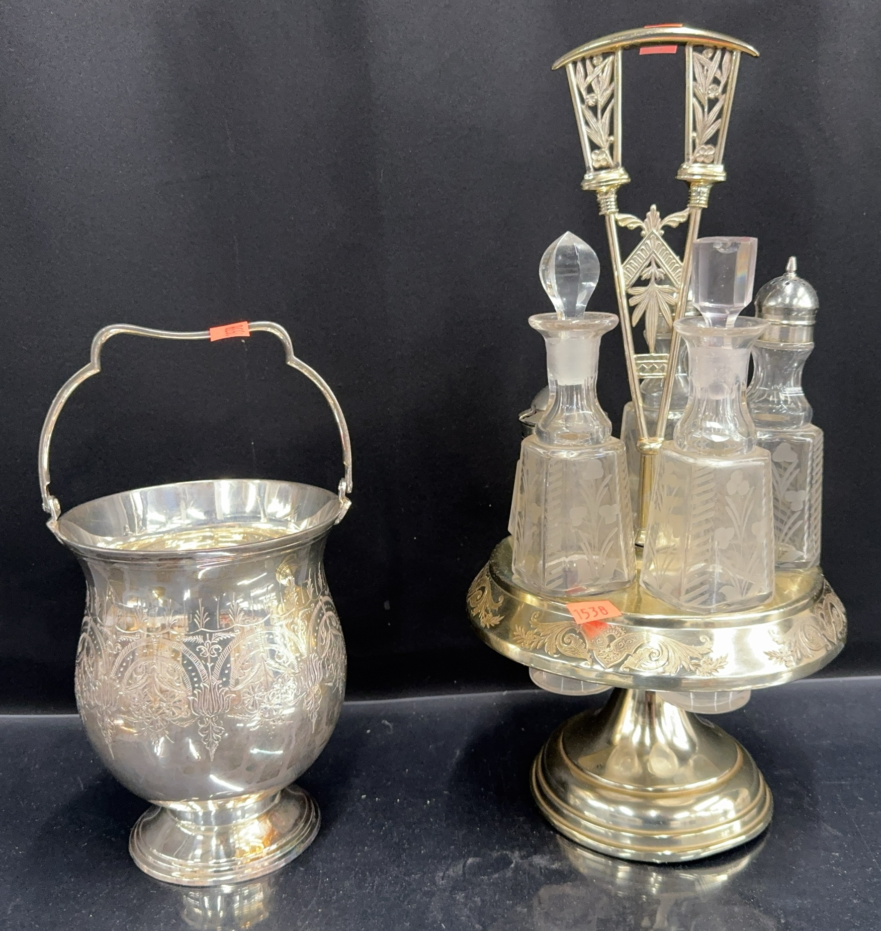 Victorian Etched Glass Cruet Set and Silverplate Handled Chiller - 15" of tallest