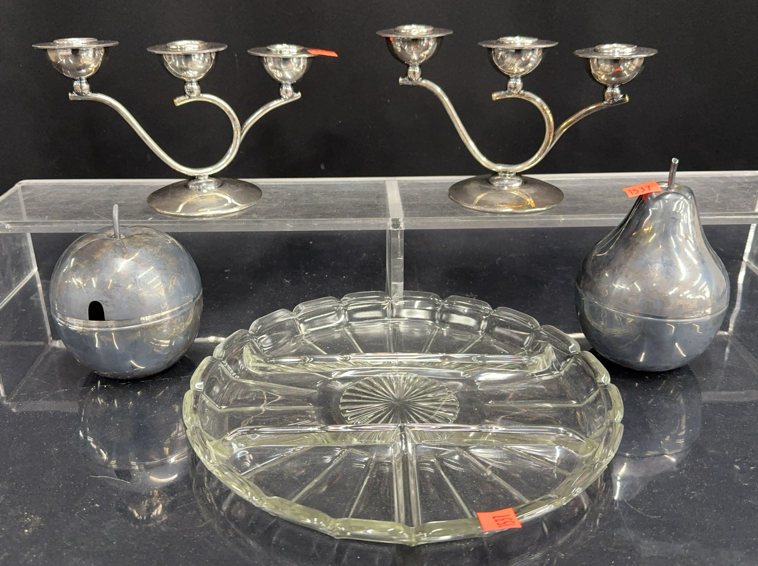 Silverplate Candlesticks, Apple & Pear Condiments, Glass Tray - Reed & Barton and Other - 10" of tray