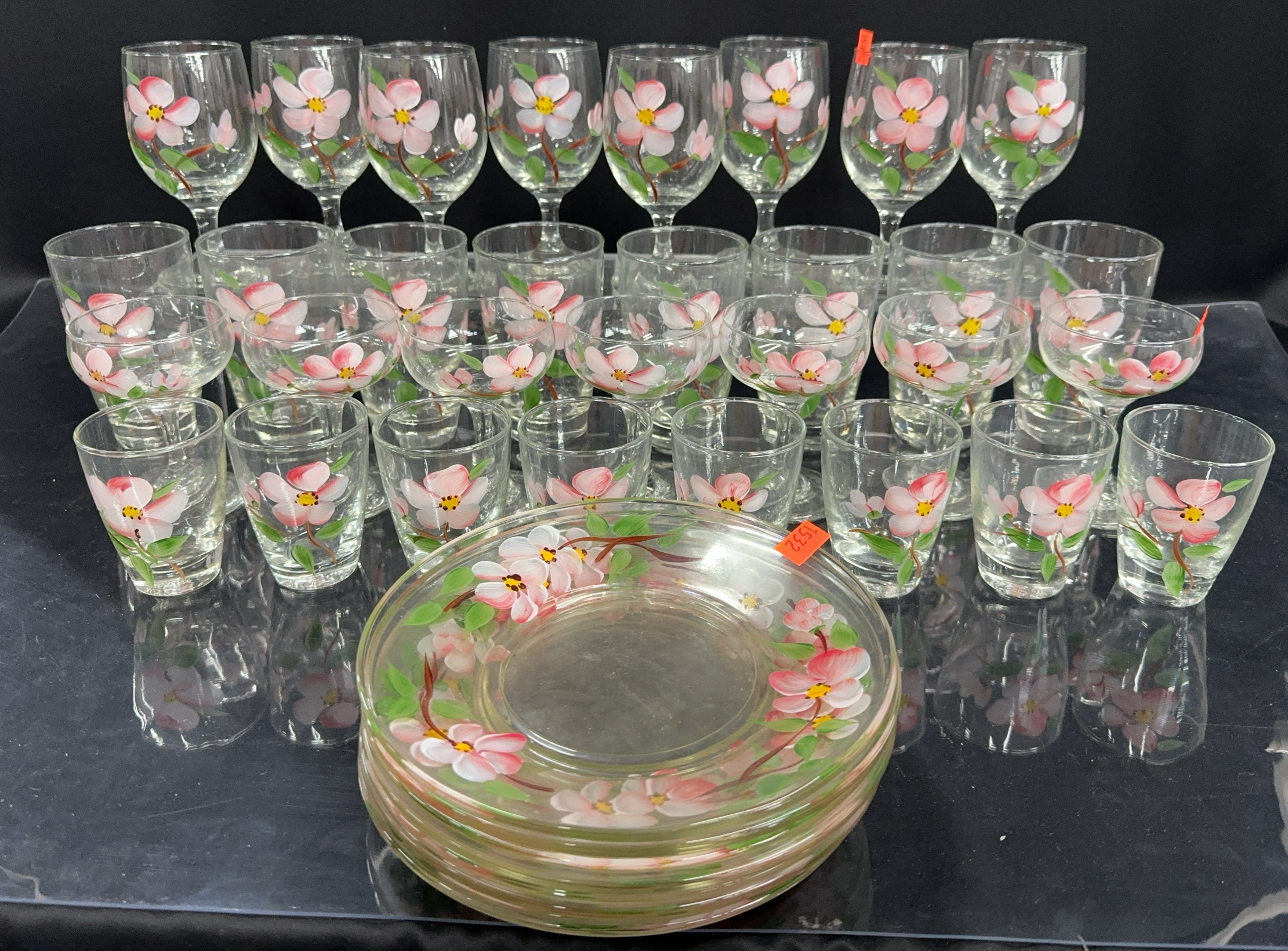 Franciscan Desert Rose Painted Glasses, Stemware, Plates - 8" D of plate - Approx 36pcs