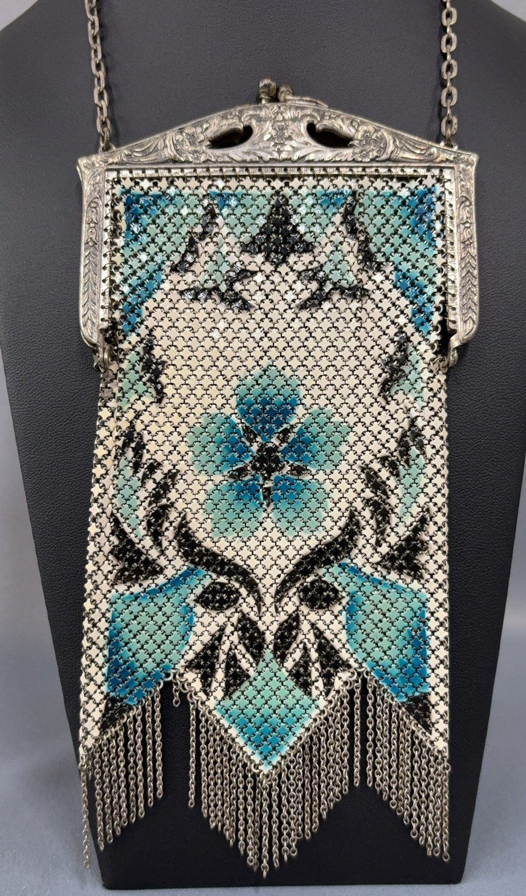 Art Deco Mandalian Mesh Enameled Purse - 7" x 4" - 5" handle drop - small section needs reattached