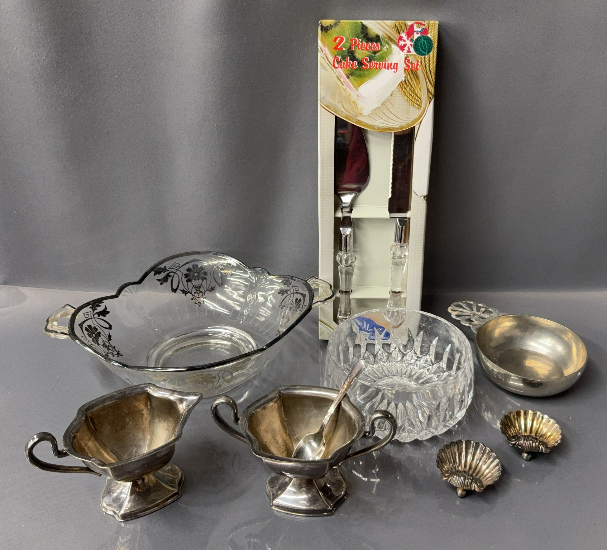 Silverplate and Pewter Cream and Sugar, Salts, Dish - Cake Serving Set - Glass Bowls - 12" of knife