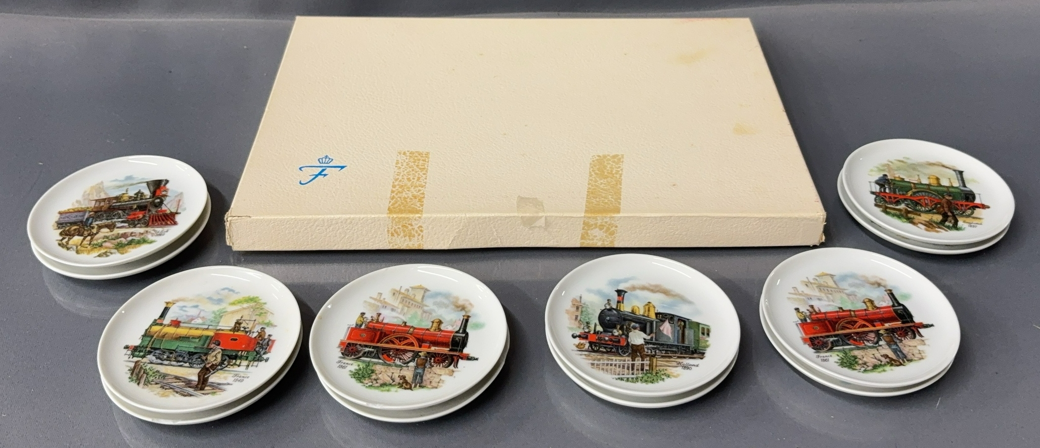 18 Train and Fruit Motif Porcelain Coasters - 4" D of largest - some chipping