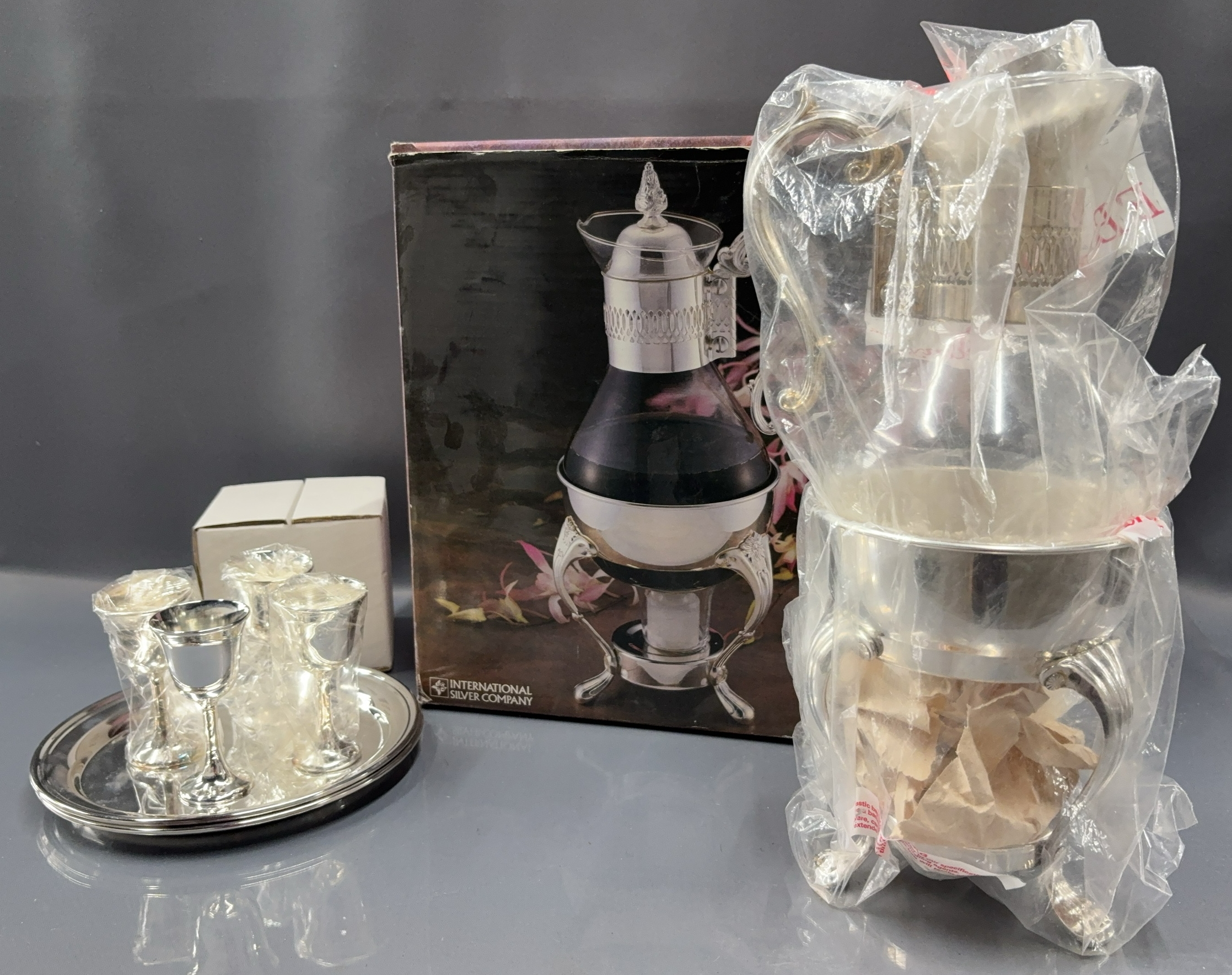 Silverplate & Glass Coffee Pots, Cordial Stems, Small Tray - 14" of tallest