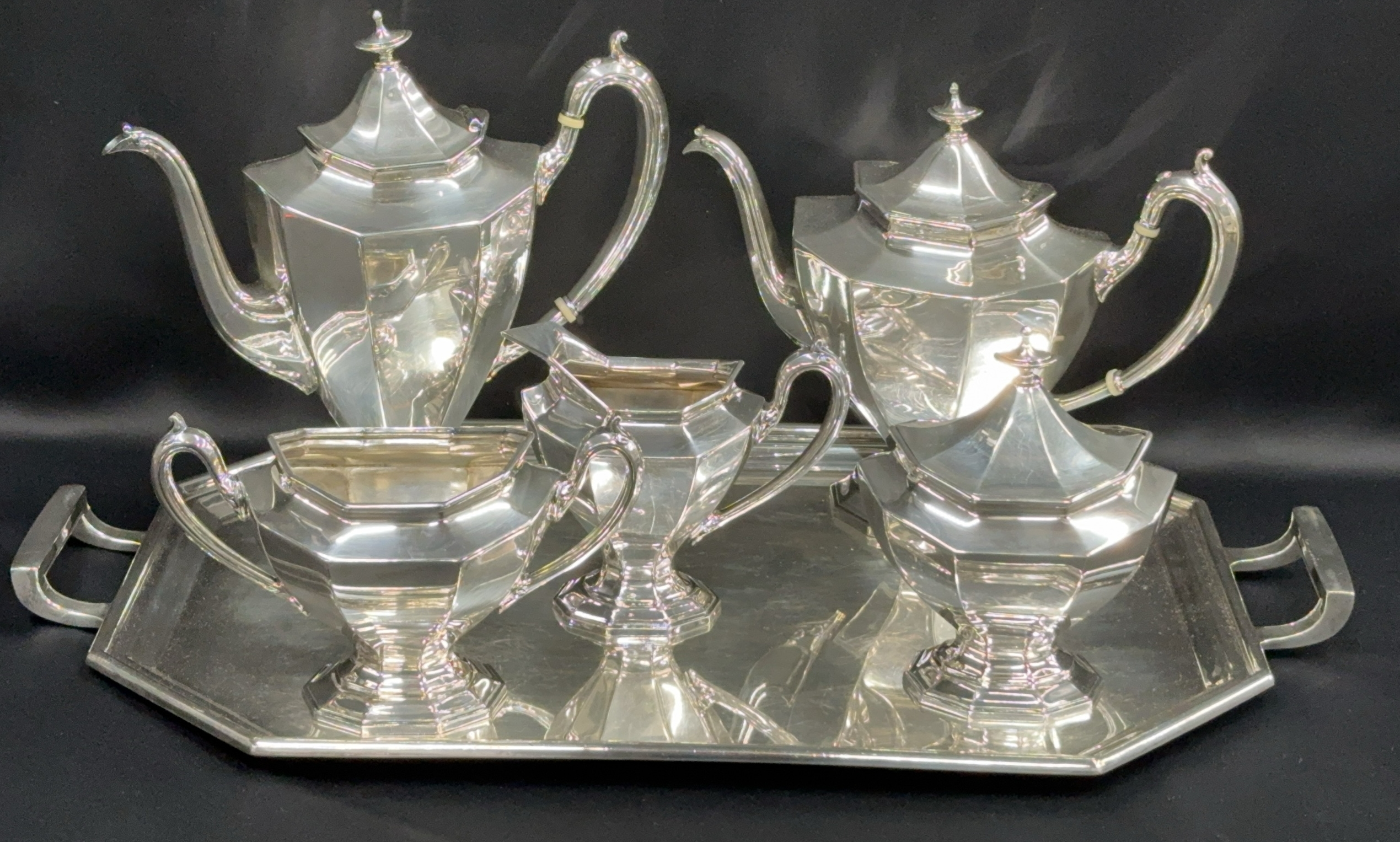 Reed & Barton Sierra Neo Classical Silverplate Coffee/Tea Service - 6pcs - 20" of tray - missing one lid