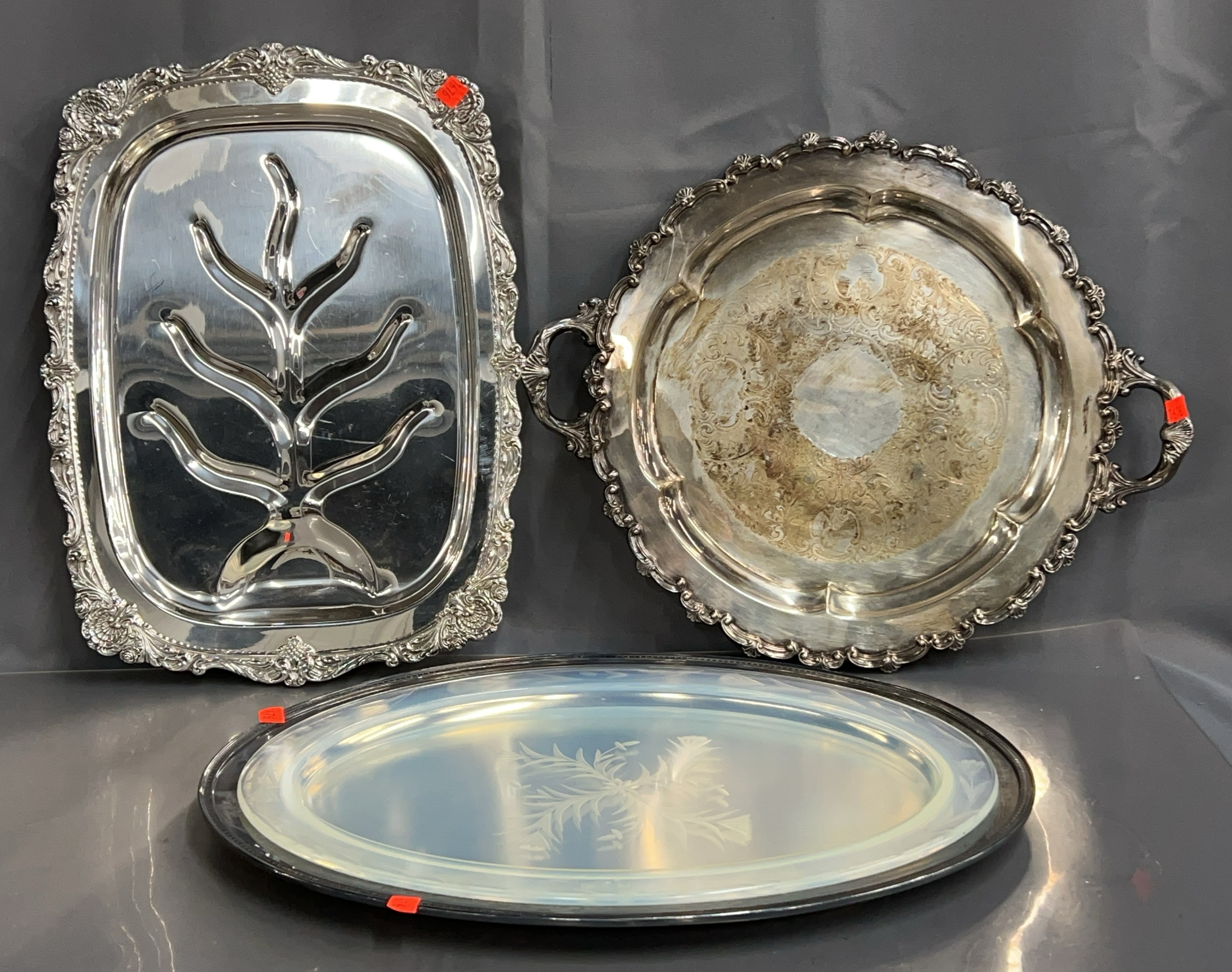 3 Silverplate Serving and Meat Tray w/ silverplate storage bags - Wallace, Rogers, and Other - 15.5" x 21" of largest