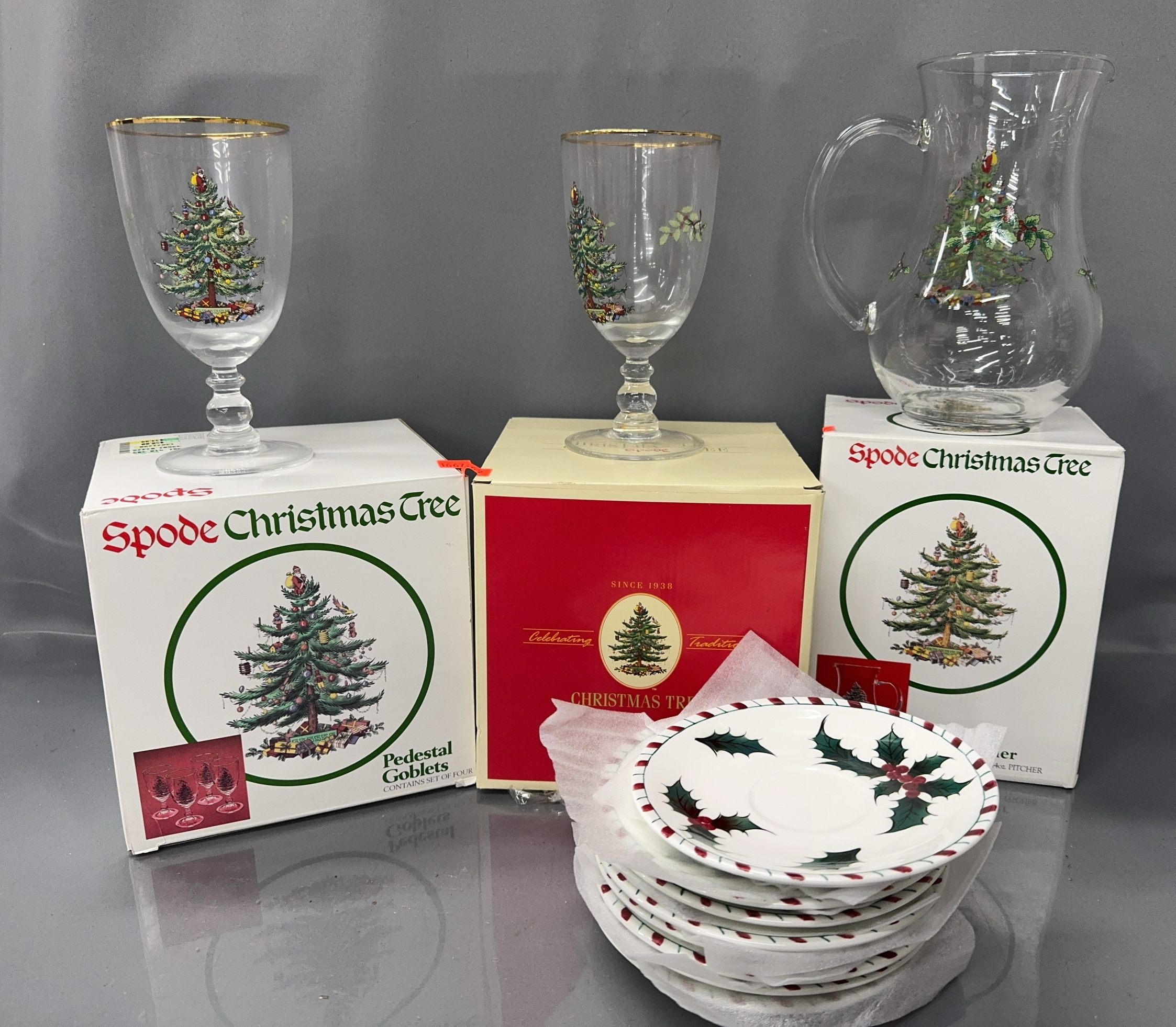Spode Christmas Tree Glass Pitcher, 8 Pedestal Goblets, Holly Motif Saucers - 6" of saucer. One box has a single stem non matching.