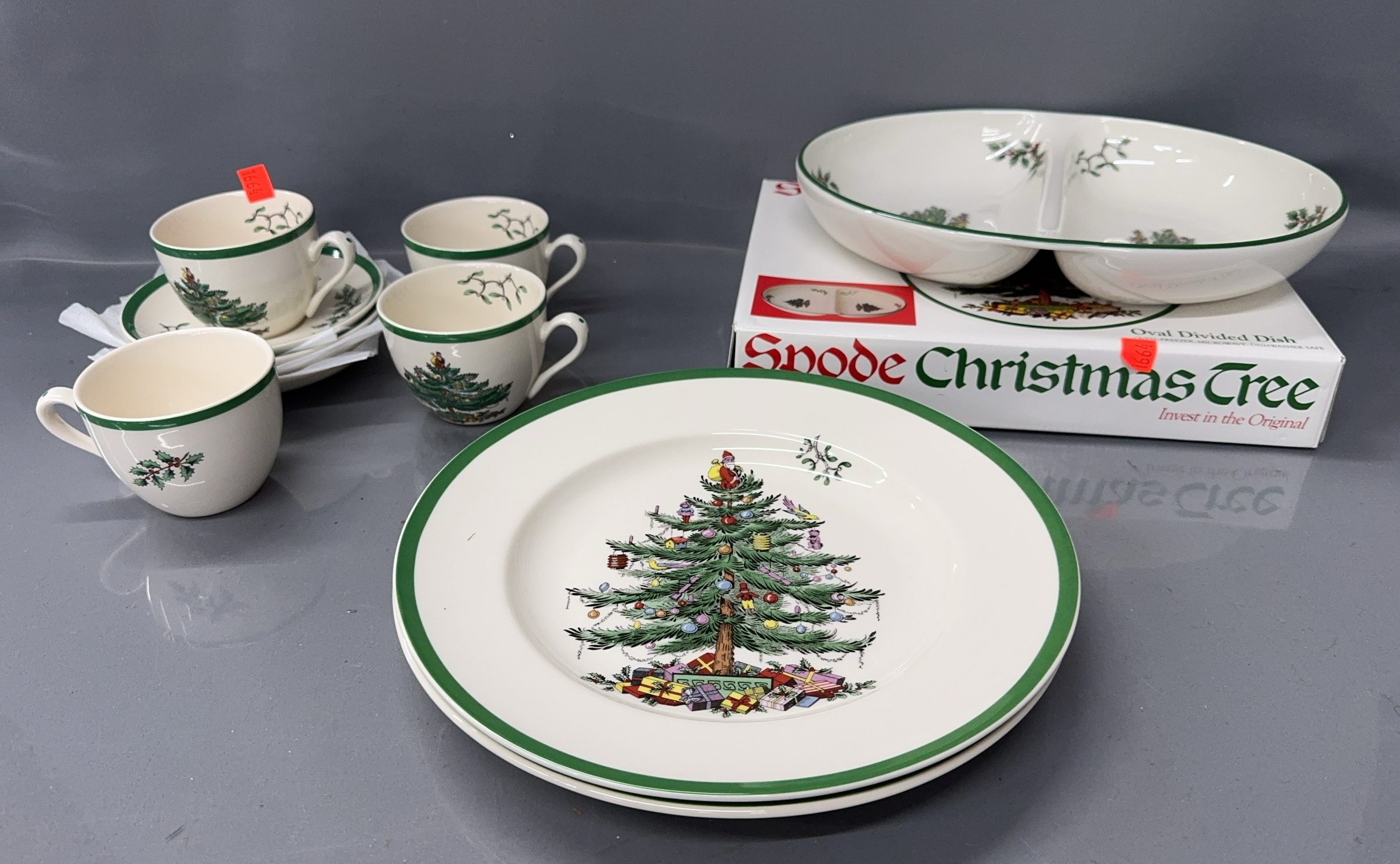 Spode Christmas Tree Cups and Saucers, Plates, Divided Dish - 11pcs - 10" of largest plate