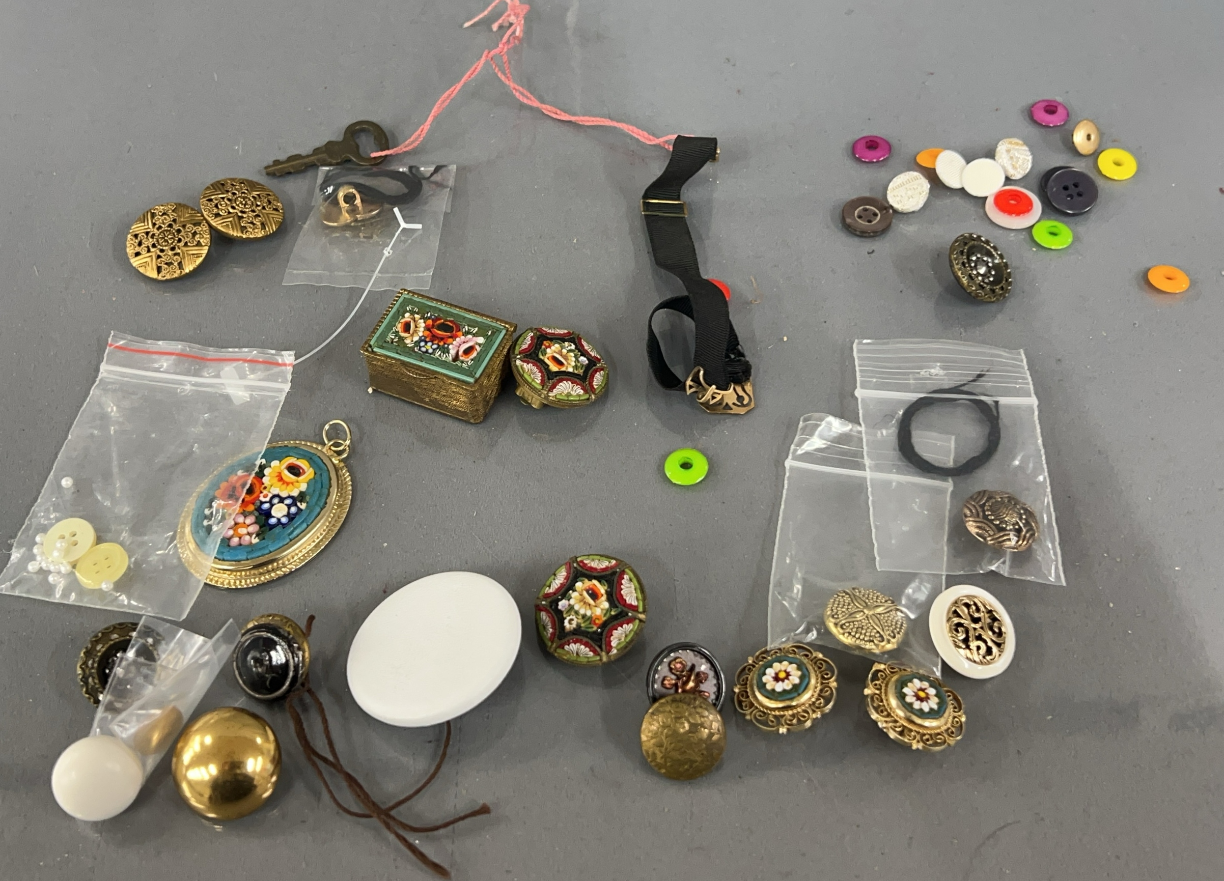 Micro Mosaic Pendant, Earrings, Pill Box and Assorted Buttons, Misc - 2" of pendant