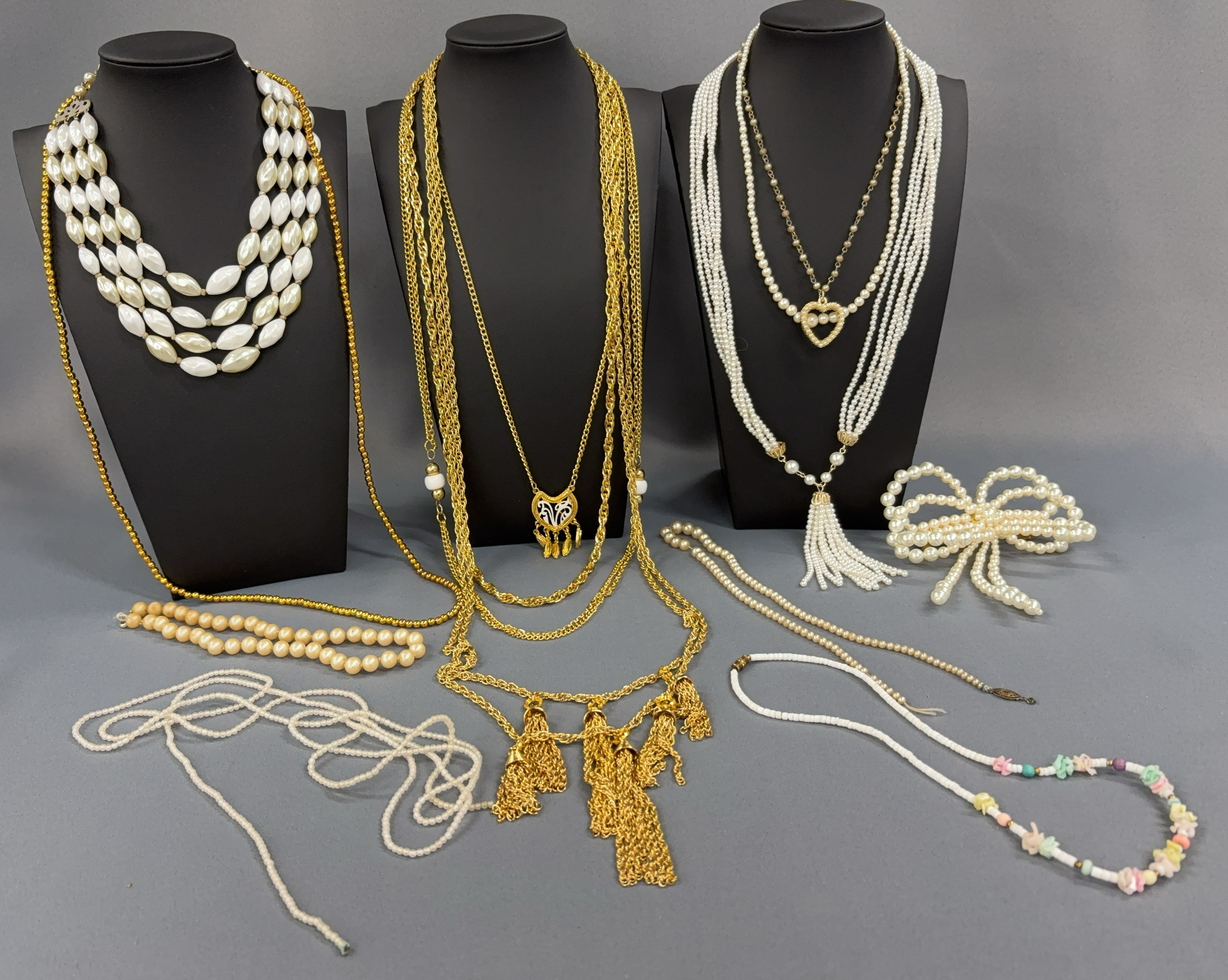 Ladies Costume Pearl Style and Gold Tone Necklaces, Hair Clip - 40" of longest