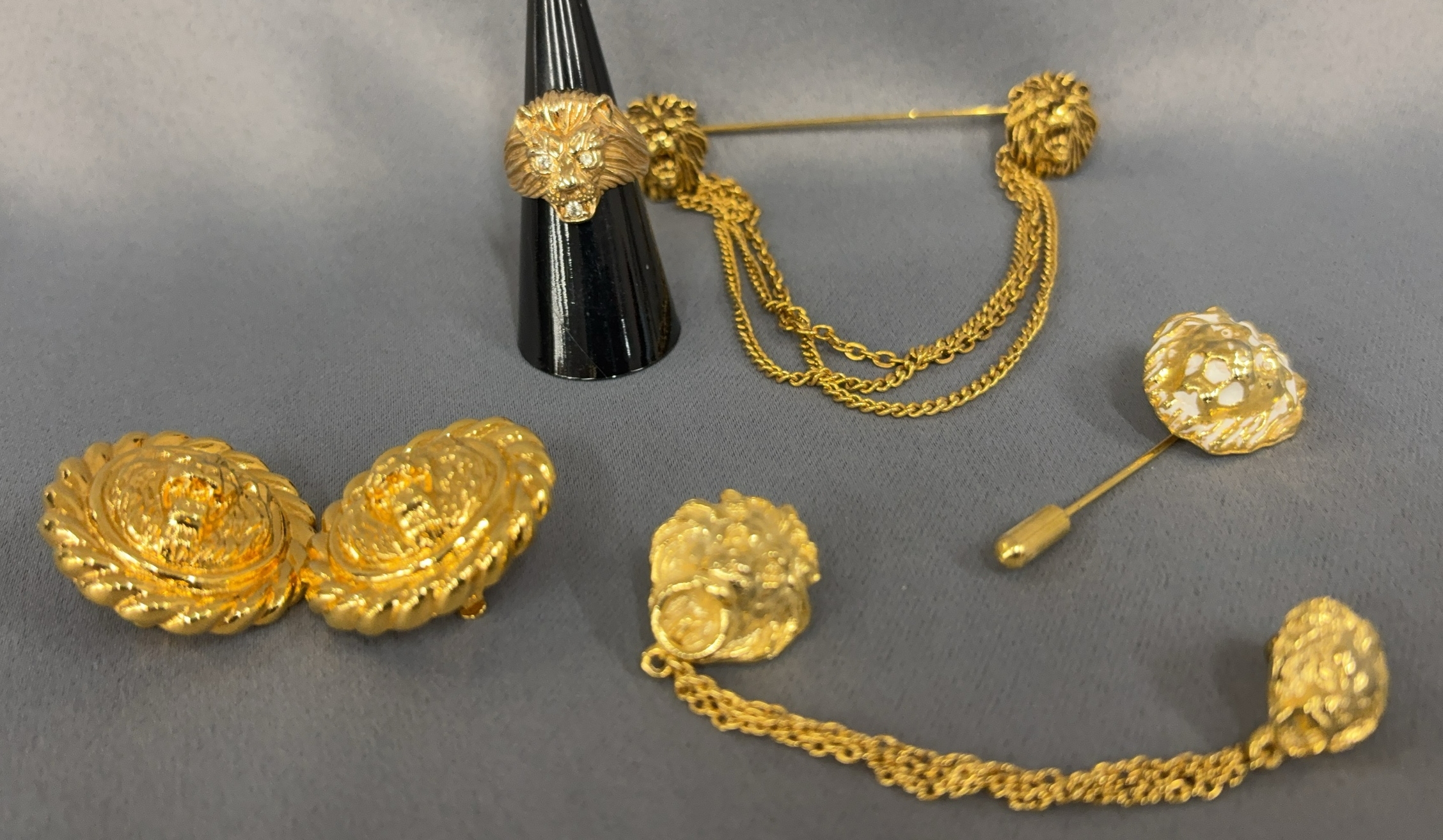 Ladies Costume Lion Head Motif Jewelry, 18K Plated Ring - Clip on Earrings, Ring, Sweater Clips, Stick Pin - Size 6 Ring