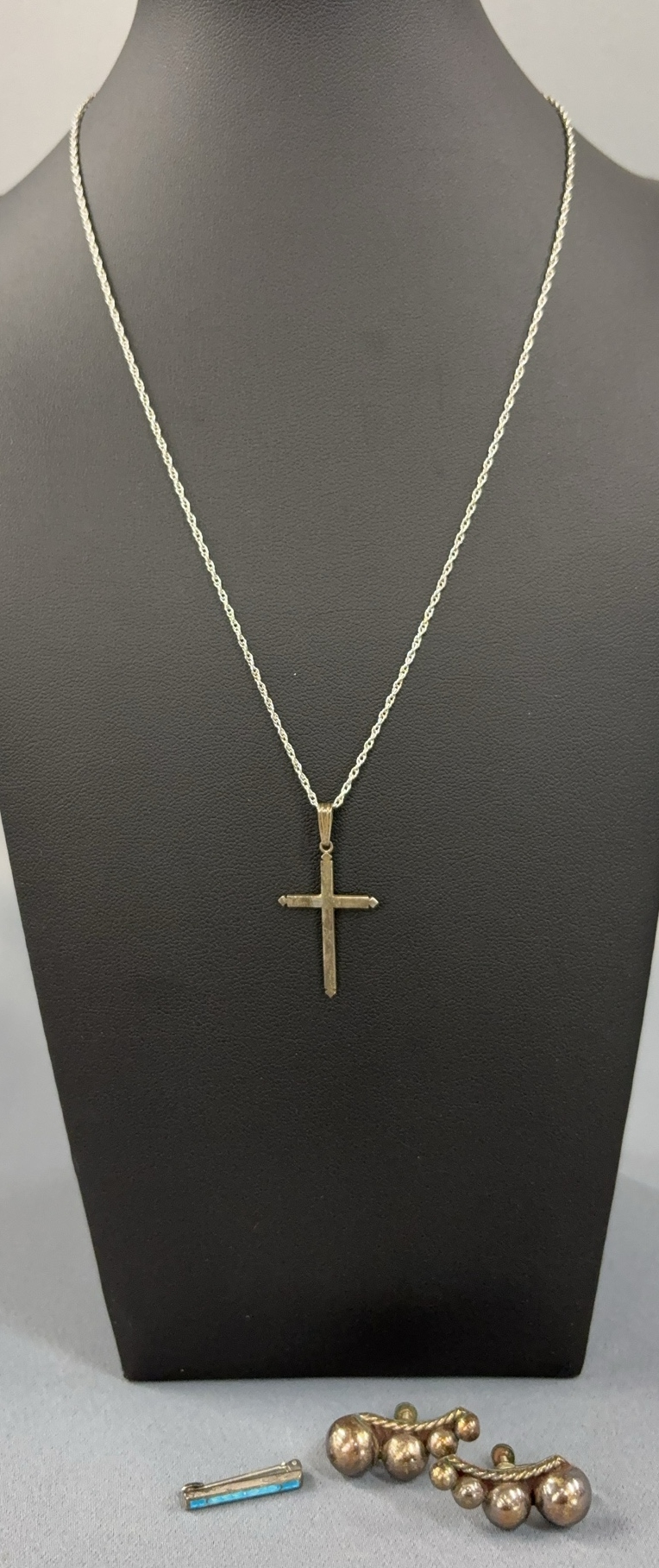 Sterling Silver Cross Pendant on Chain, Clip Earrings, Small Pin - 10" of chain