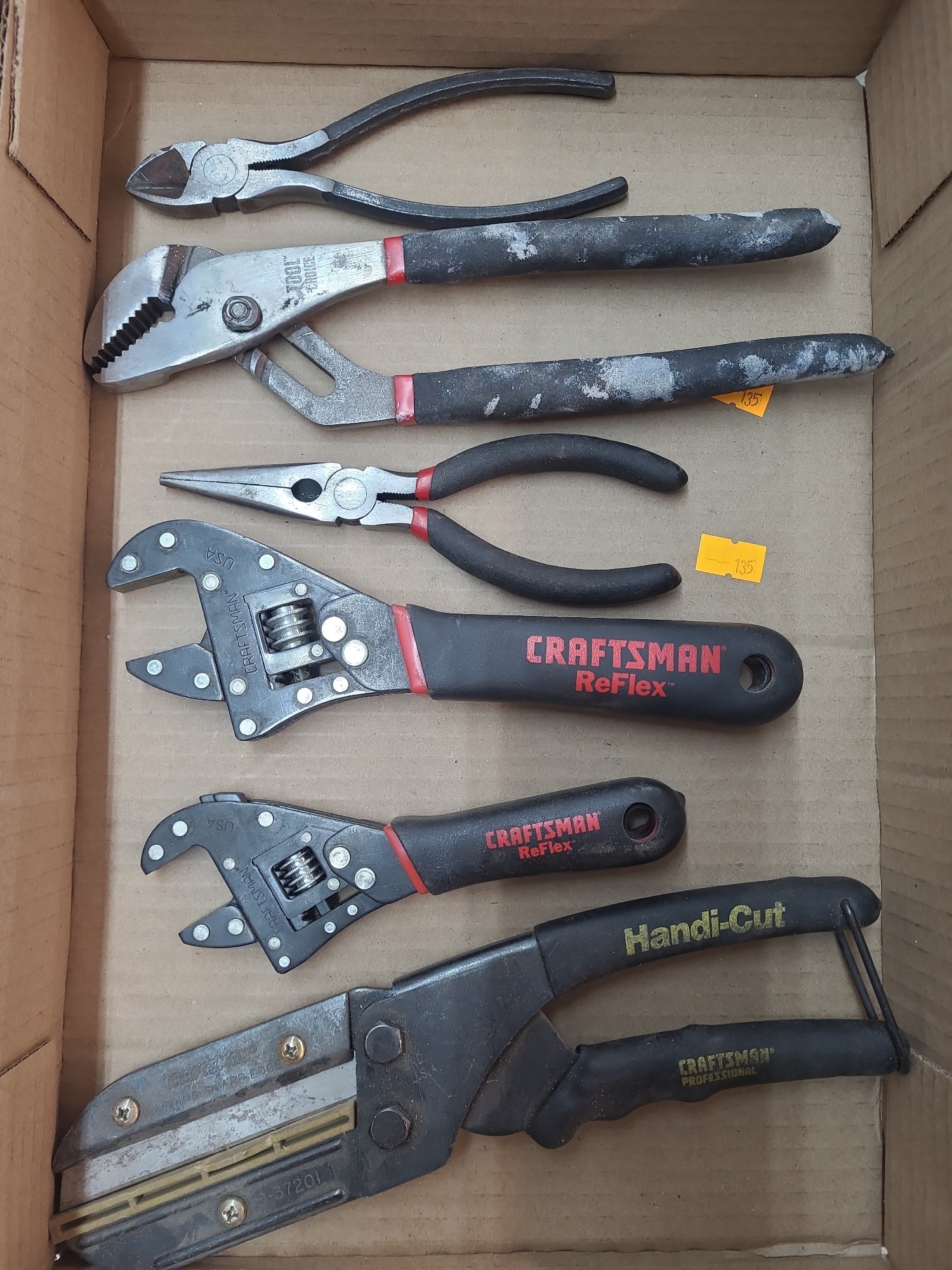 1 box of craftsman adjustable wrenches, pliers, 1 craftsman handi-cut tool