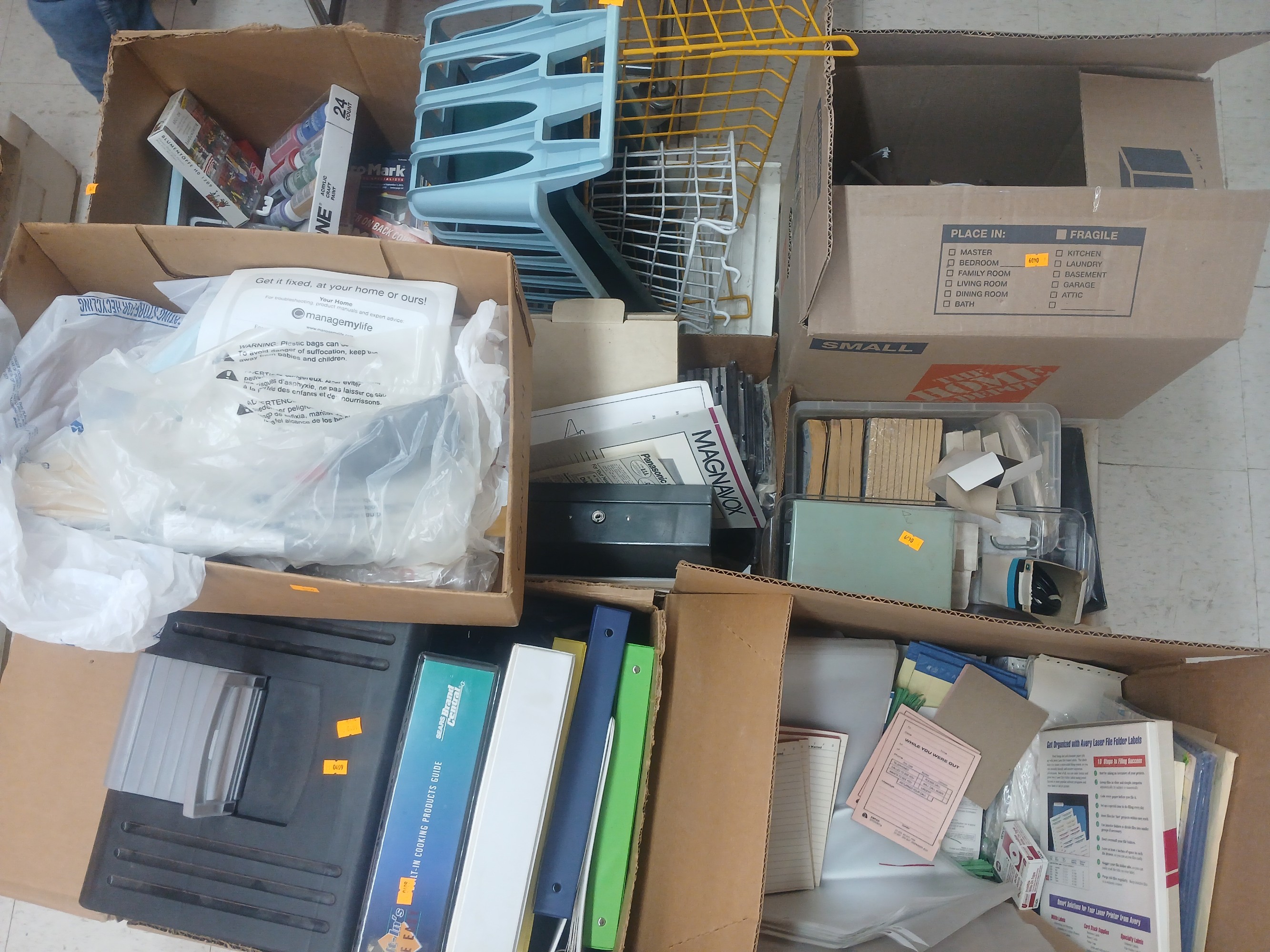 PPallet of misc binders, paper, paints, pens ,pencils and organization racks.