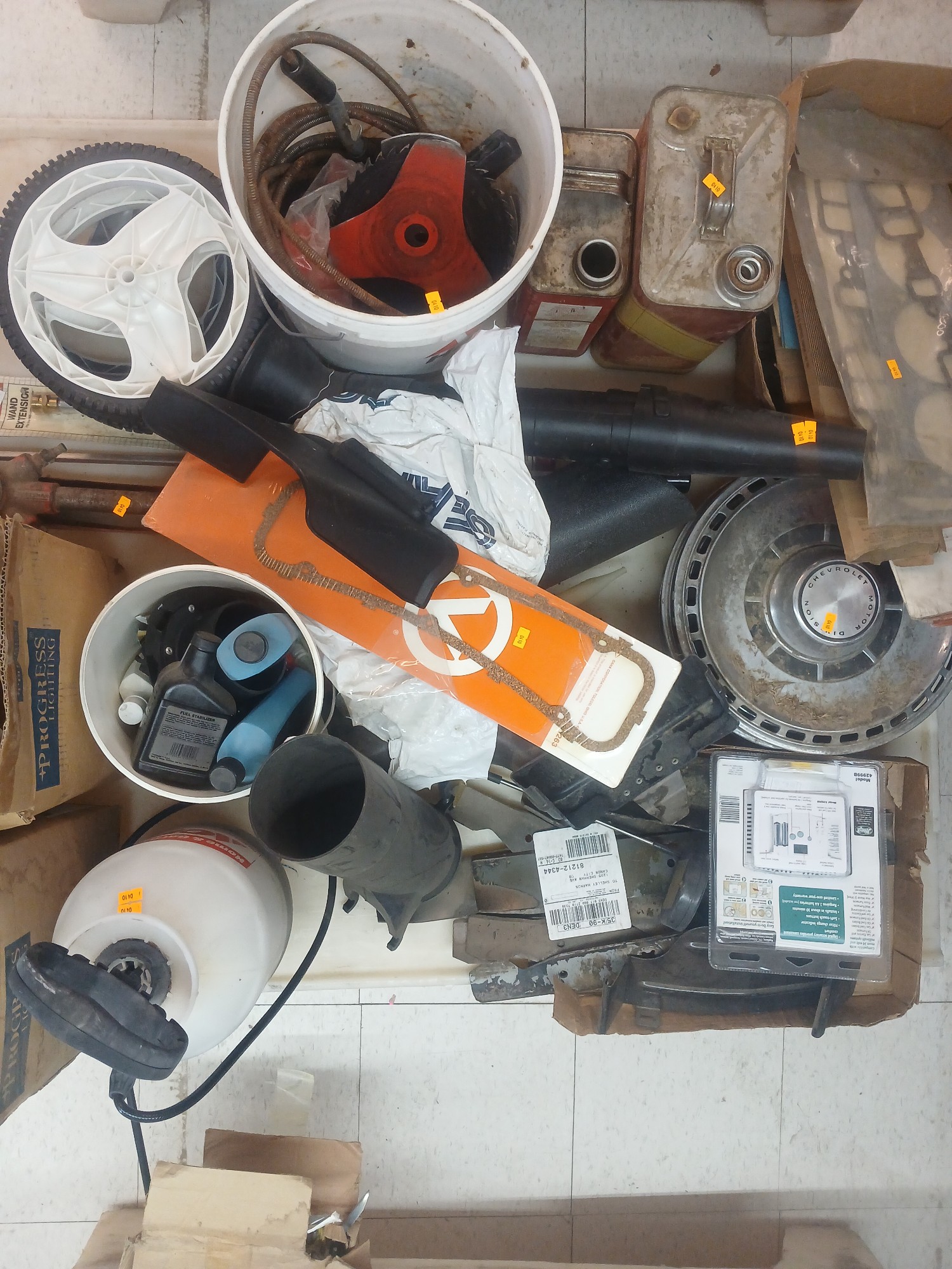 MMisc car parts, light fixtures, chemical sprayer, plastic tires, chevy hub caps, lawnmower blade. ++