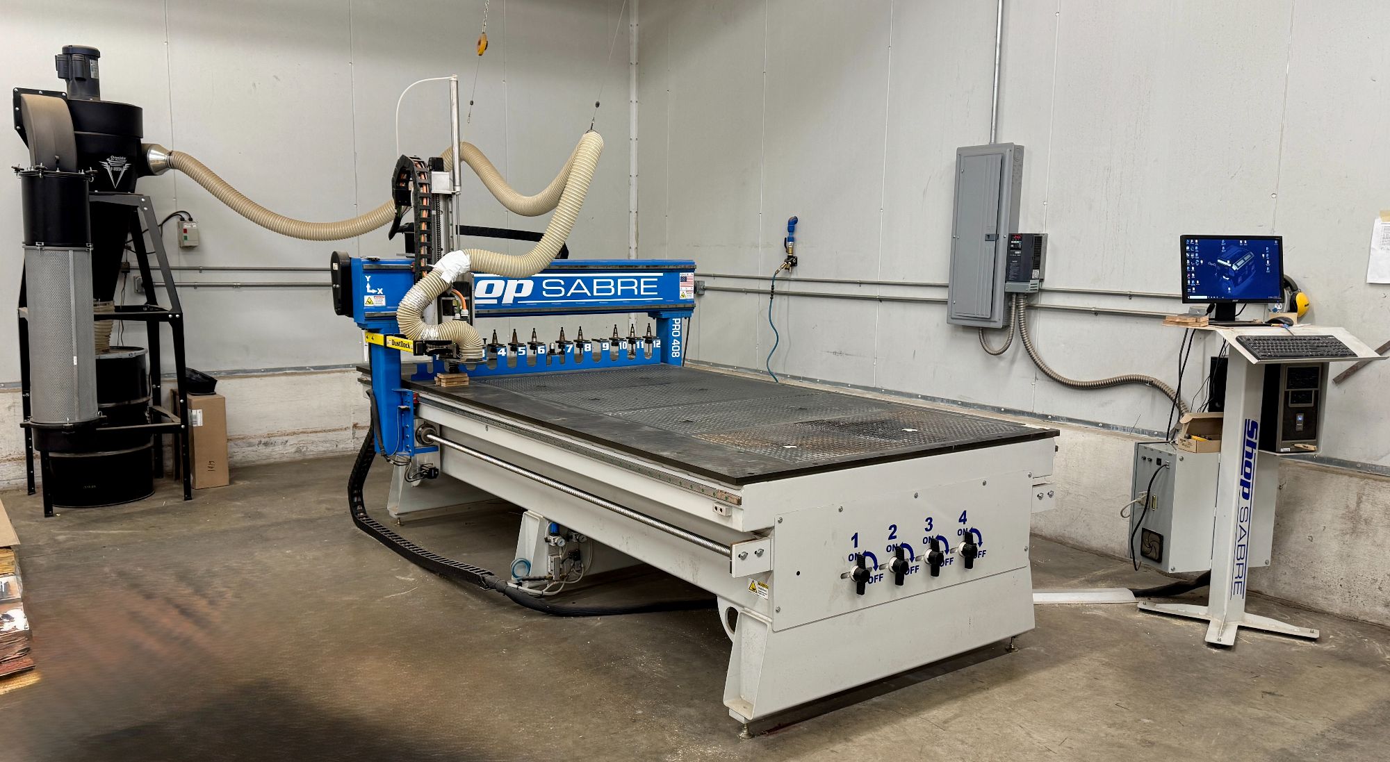 ShopSabre Pro 408 CNC production router with an approximate 5-foot by 8-foot working area, configured with a full vacuum table and front-mounted vacuum zone controls. The machine is equipped with a multi-position tool rack along the gantry, integrated cable management, spindle carriage assembly, and visible vacuum plumbing consistent with full-sheet CNC routing operations. The primary router unit was measured on site at approximately 134 inches long by 62 inches wide by 34 inches high. Included with the router is the ShopSabre control station featuring a dedicated pedestal, desktop computer, monitor, keyboard, and associated control electronics used for machine operation. Dust collection is handled by an adjacent Oneida Air Systems V-System cyclone dust collector with filter canister, collection drum, motor assembly, and connected ducting routed to the CNC machine. Also present in this lot is a separate floor-mounted vacuum or blower unit with multiple intake ports. The unit was observed powered on during inspection, and the seller reports it has remained in regular use while the facility completes remaining production work. Seller will arrange for electrical disconnection of the machine prior to removal. Buyer is fully responsible for all rigging, loading, transportation, and removal. Offered With Reserve