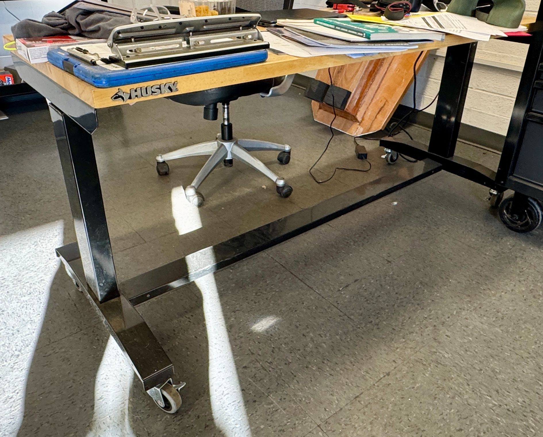 Adjustable-height Husky workbench measuring approximately 52 inches wide by 24 inches deep. Features a solid wood work surface mounted on a black steel frame with a center pedestal base and wide stabilizing feet. Equipped with four swivel casters for mobility within a shop or workspace. Contents shown on the work surface are not included.