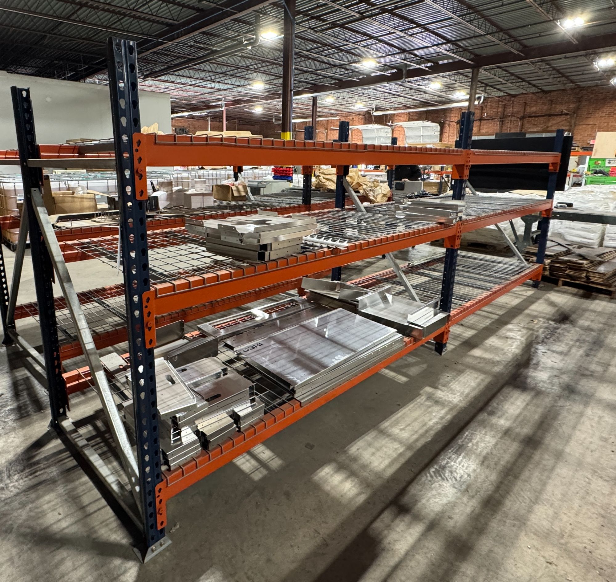 Upright frames feature standard teardrop-style connections for beam adjustability and include horizontal and diagonal bracing for structural support. Beams are fitted with metal wire decking suitable for palletized or shelf storage. Approximate beam length is 8 ft, rack depth is 3.5 ft, beam thickness is approximately 4 in, and overall upright height is approximately 6 ft. Contents shown on the racking are not included.
