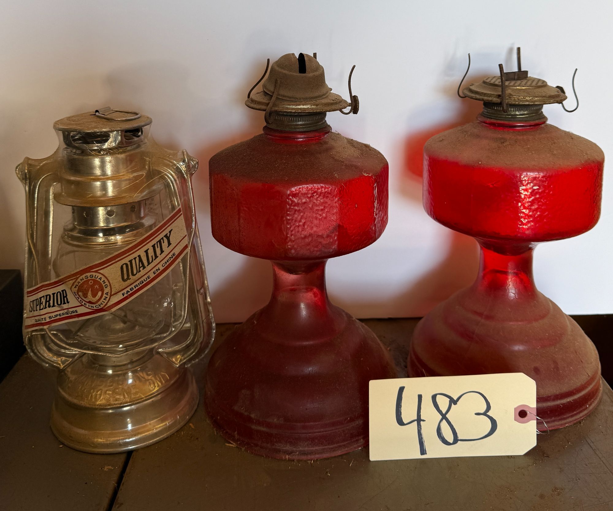 TWO VINTAGE OIL LAMPS AND ONE SUPERIOR QUALITY KEROSENE LAMP