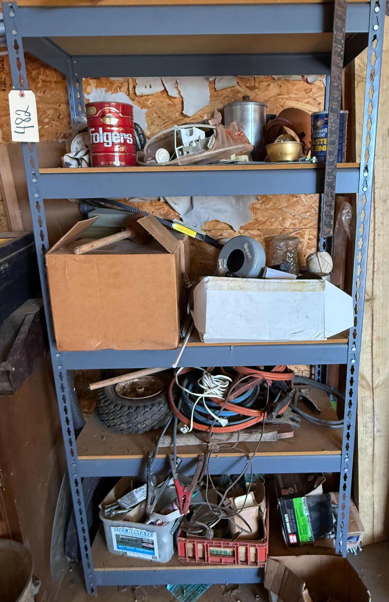 FIVE SHELF METAL SHELF WITH CONTENTS: JUMPER CABLES, BOLTS AND SCREWS, VASES, ALUMINUM COFFEE POT AND RIDGID DRAIN CLEANER