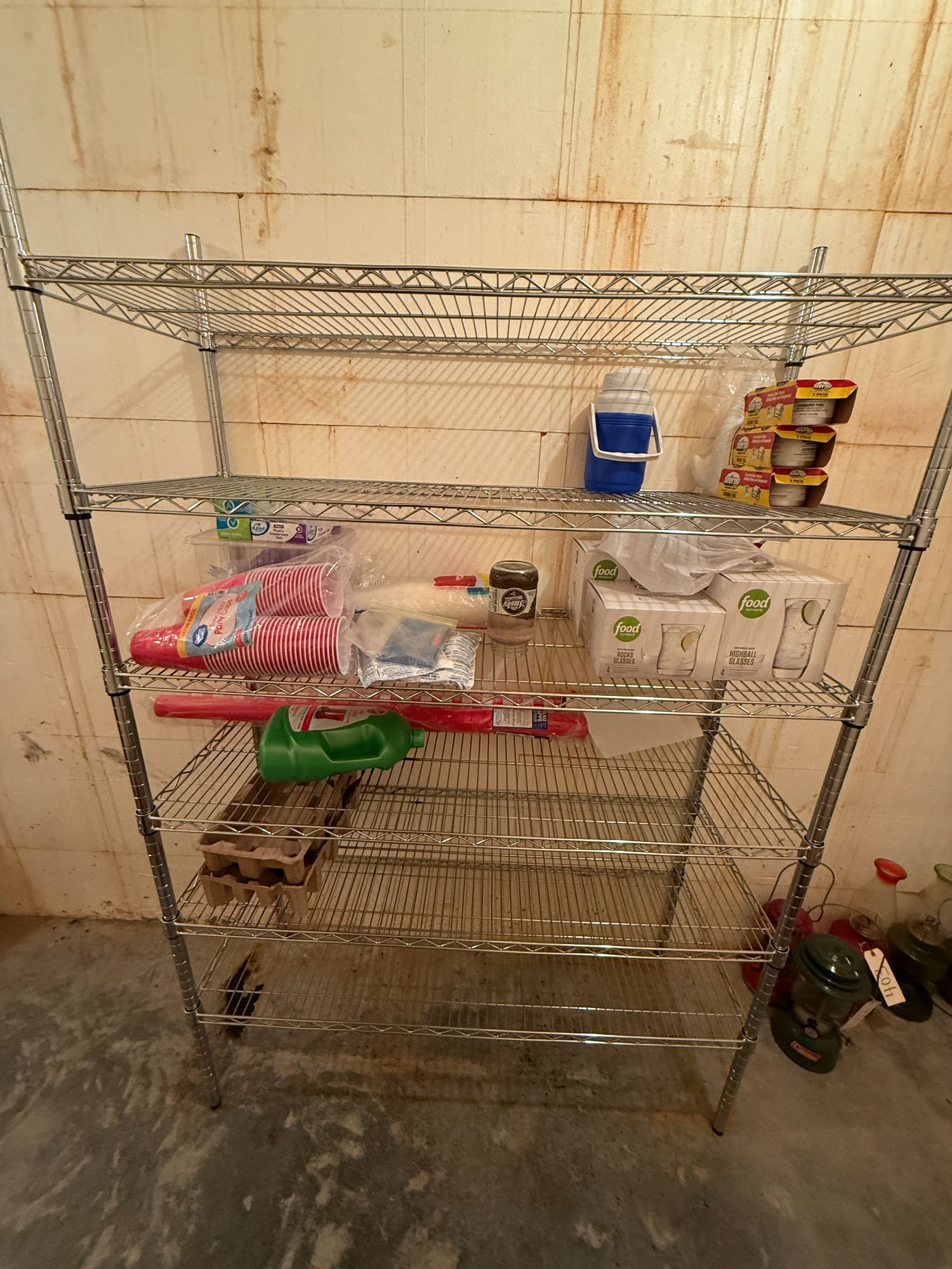 STAINLESS STEEL KITCHEN SHELF IN GOOD SHAPE WITH CONTENTS: 12 HIGHBALL GLASSES IN BOX, FOUR ROCKS GLASSES IN BOX, PLASTIC CUPS, THERMOS, SIX PACK OF STERNO COOKING FUEL