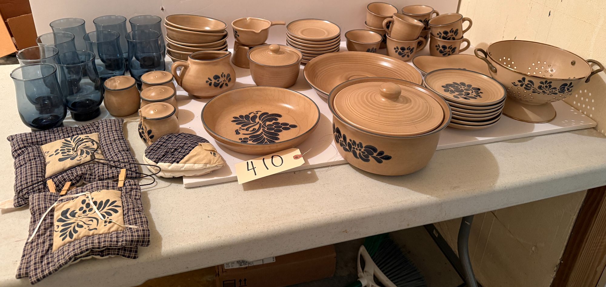 PFALTZGRAFF STONEWARE FOLK ART DISHES: COFFEE MUGS, 2 QUART CASSEROLE, CHIP AND DIP, EIGHT SAUCERS, SEVEN DESSERT PLATES, ONE HEART SHAPED PLATE, ONE CALENDAR, ONE SHELL PIPE PLATE, CREAM AND SUGAR, NINE BLUE GLASSES, POTHOLDERS, TWO SALT AND TWO PEPPER SHAKERS AND BUTTER WARMING DISH