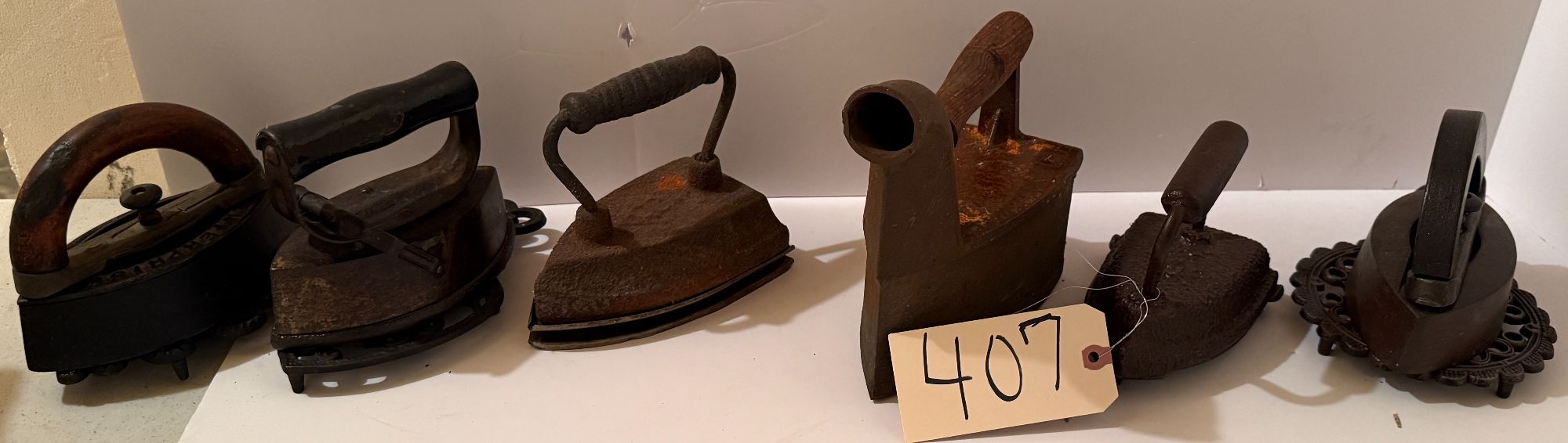 FIVE VINTAGE SAD IRONS AND ONE COAL IRON