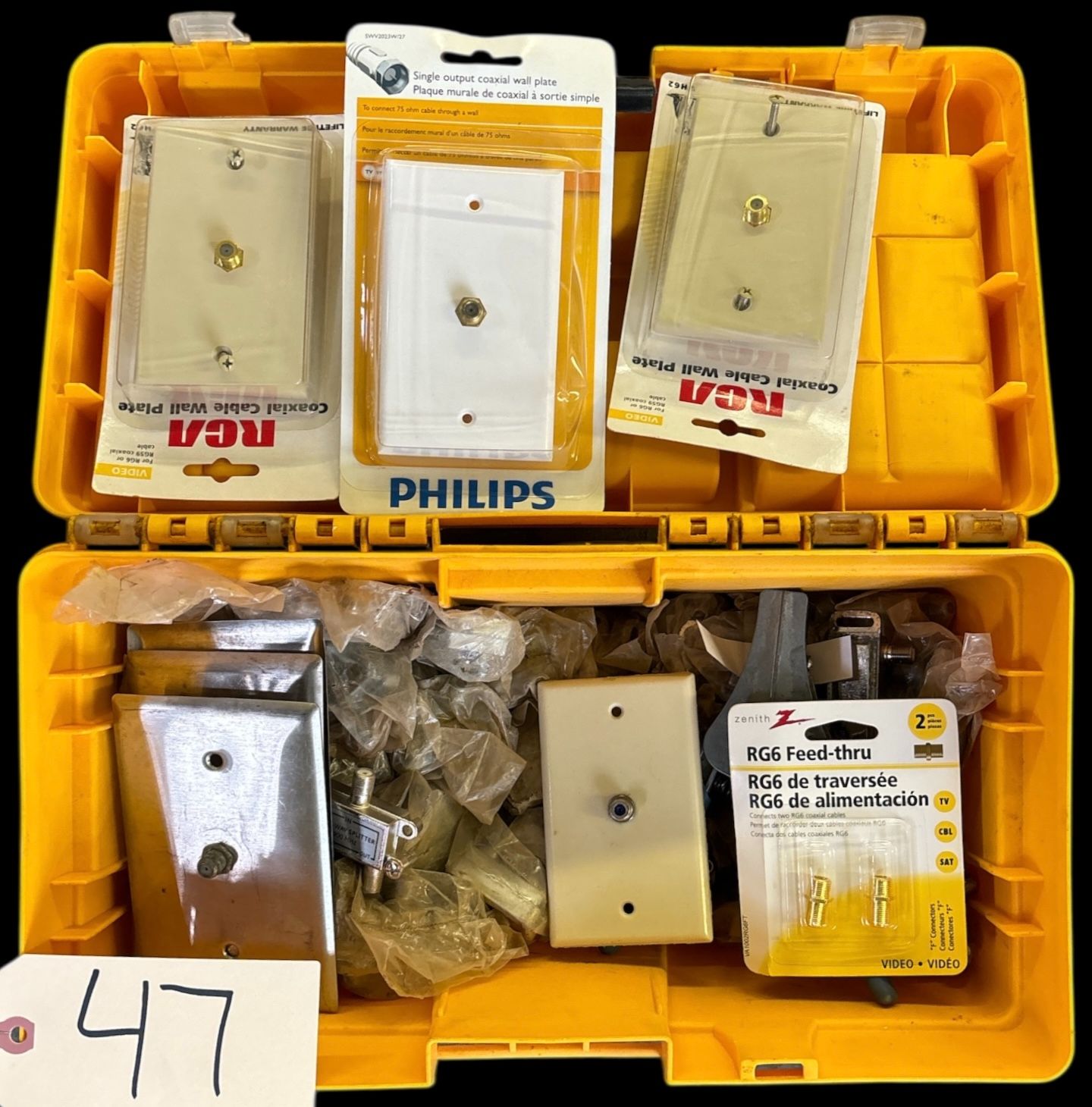 PLASTIC TACKLE BOX WITH CABLE TV INSTALLATION TOOLS