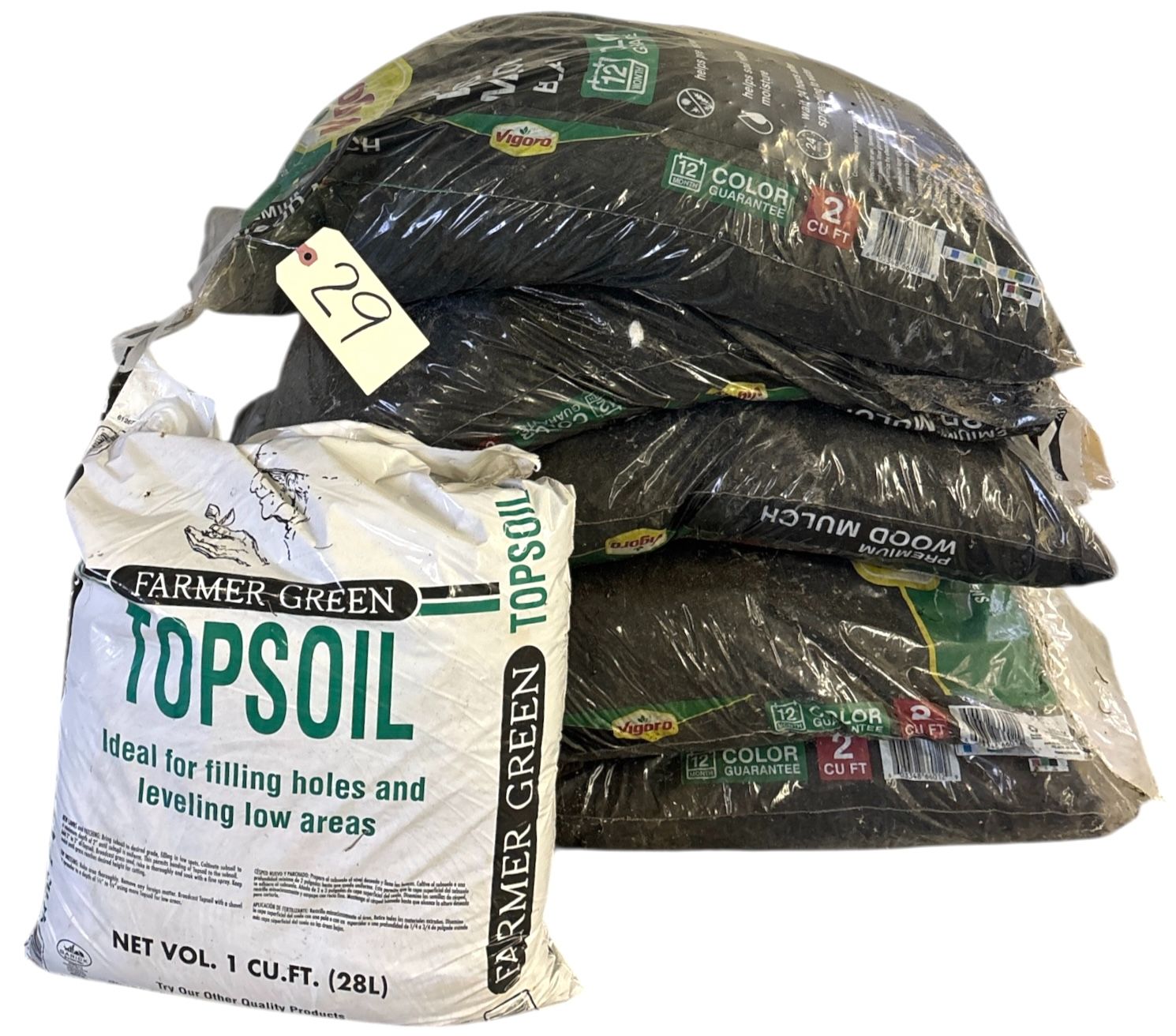 5 BAGS OF VIGORO PREMIUM BLACK MULCH 2.0 CU. FT./BAG, PARTIAL BAG OF TOPSOIL