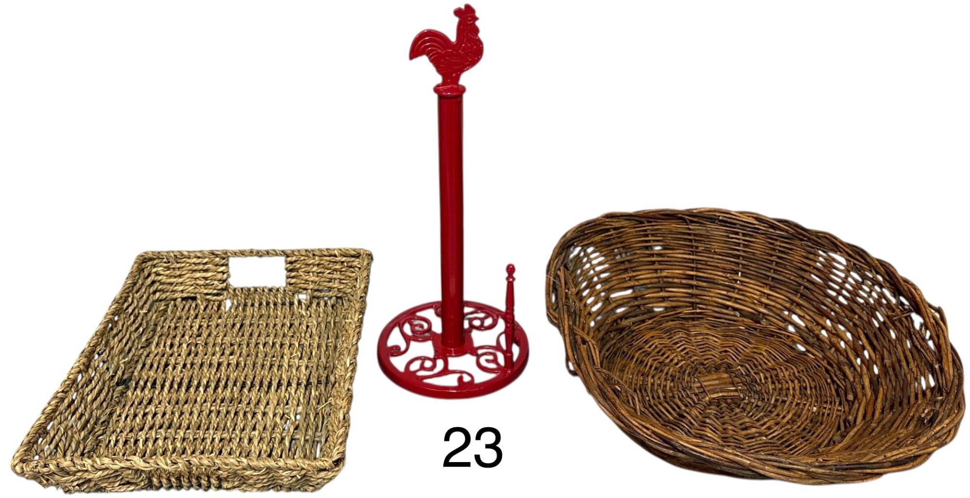RED METAL ROOSTER PAPER TOWEL HOLDER, OVAL GRAPEVINE BASKET, 9 X 13 WOVEN BASKET