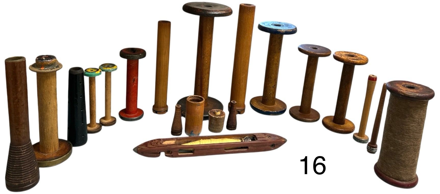 ASSORTMENT OF 18 VINTAGE WOODEN SPOOLS AND 1 SHUTTLE