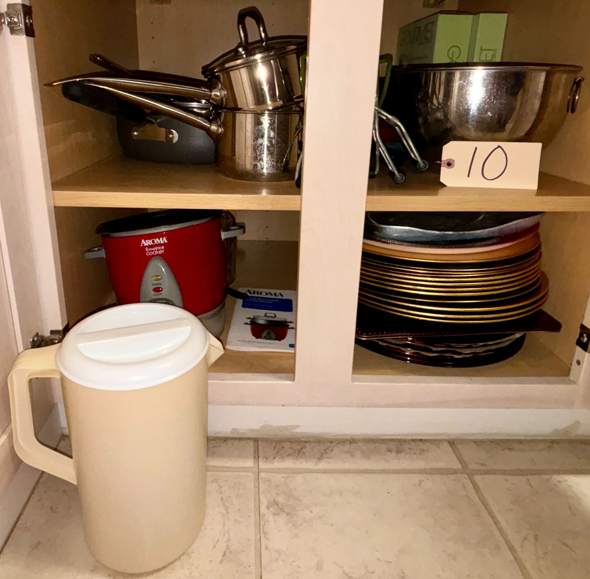 STAINLESS STEEL DOUBLE BOILER, SS SKILLET, 3 TEFLON SKILLETS, 6 SS NESTING BOWLS, LARGE TEFLON SAUCEPAN WITH LID, APPROX. 19 PLASTIC CHARGERS, RUBBERMAID PLASTIC 1 GAL PITCHER, 6 CUP AROMA BRAND ELECTRIC RICE COOKER, NON-STICK BUNDT PAN, 2 CANNING JAR HANDLERS