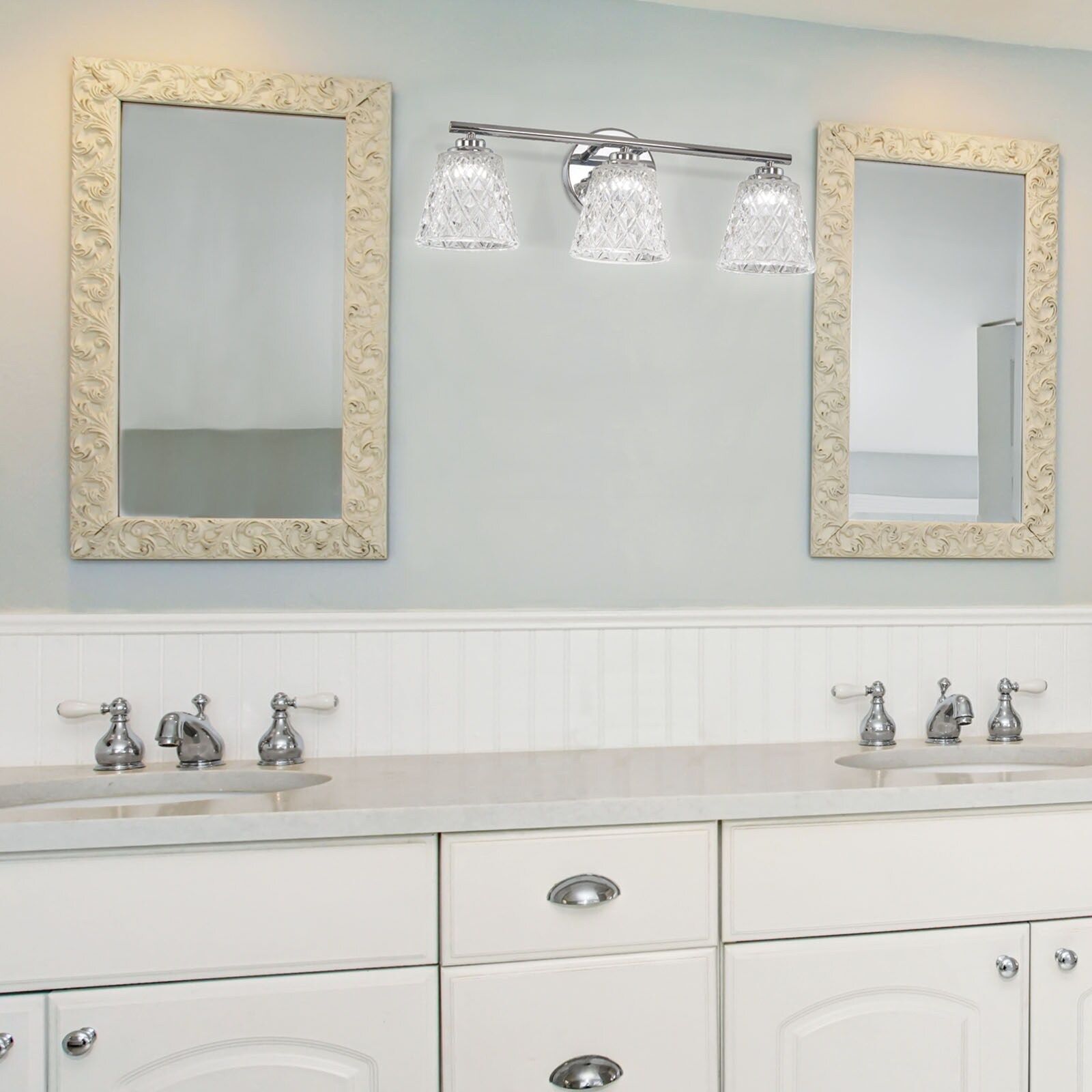 A stylish vanity light adds the perfect touch of charm and appeal to your home. Designed for Allen + Roth, the Gracey Collection makes a great bathroom option for modern and contemporary home designs. Featuring a stunning Brushed Nickel Finish with Etched Opal Glass Shades for a beautiful finishing touch. Truly a work of art and design. The Gracey Collection is another great addition to The Allen + Roth Family. Featuring a stunning Brushed Nickel Finish with Etched Opal Glass Shades. Uses Three 4-Watt LED bulbs which is included. Overall dimensions: 21.93 in wide x 7.62 in height x 6.56 in depth. Mounting hardware and instruction manual enclosed for easy installation. ETL Certified and Damp Rated, suitable for indoor locations. This product has met the minimum requirements of widely accepted product safety standards. Designed for Allen + Roth for the Presli Collection. Collection Name: Presli. Fixture Color Family: Chrome. Fixture Finish: Gloss. Light Color: Warm White. Manufacturer Color/Finish: Chrome. Shade Color: Clear Glass. Type: Vanity light. Back Plate Height (Inches): 5. Back Plate Width (Inches): 5. Depth (Inches): 6.56. Fixture Width (Inches): 21.93. Height (Inches): 7.62. Weight (lbs.): 6.39. ADA Compliant: No. Bulb Type: LED. Bulb(s) Included: Yes. Dimmable: Yes. Fixture Material: Metal. For Use in Bathrooms: Yes. For Use in Bedrooms: Yes. For Use in Dining Rooms: Yes. For Use in Foyers: Yes. For Use in Kitchens: Yes. For Use in Living Rooms: Yes. Frosted Glass: No. Glass Type: Clear glass. Light Bulb Base Type: Integrated. Light Direction: Down. Lowe's Exclusive: Yes. Lumens: 820. Maximum Bulb Wattage: 4. Maximum Fixture Wattage: 12. Mounting Hardware Included: Yes. Mounting Type: Wall. Number of Bulbs Included: 3. Number of Bulbs Required: 3. Number of Lights: 3. Package Quantity: 1. Power Source: Hardwired. Recommended Light Bulb Shape: Single. Shade Included: Yes. Shade Material: Glass. Shape: Bell. Style: Modern/contemporary. Usage Rating: Damp rated. Safety Listing: ETL safety listing. UNSPSC: 39111500.