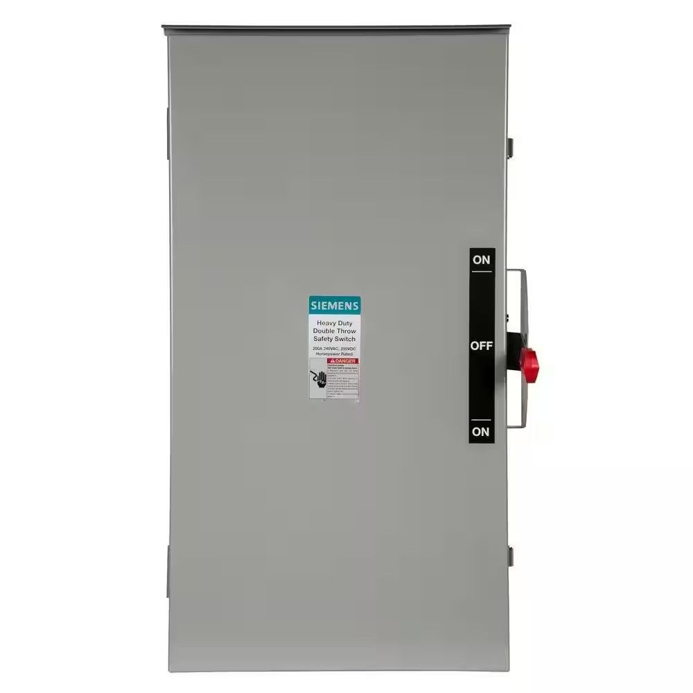 Double Throw switches are intended to transfer loads from 1 power source to another. All 2 and 3-pole double throw switches are suitable for use as service equipment including non-fusible versions when used in combination with a UL listed circuit breaker or fusible switch. All are UL Listed and both horsepower and load break rated. Switches are rated for use on systems up to 10,000 Amp when protected with Class H fuses or 100,000 Amp when protected with Class R or Class T fuses, they can also be used to connect a single source of power to either of 2 loads.. Automatic/Manual: Manual. Disconnect Type: Safety Switch. Electrical Product Type: Safety Switch. Features: Mountable,On/Off Switch. Fused: Non-Fused. Indoor/Outdoor: Outdoor. Maximum Amperage (A): 200 A. Maximum Wattage (W): 0 W. NEMA Configuration: NEMA 3R. Phase Type: 3 Phase. Power Distribution Features: No Additional Features. Product Weight (lb.): 77.56 lb. Returnable: 90-Day. Type: Safety Switch. Voltage (V): 240 V. Certifications and Listings: ANSI Certified,UL Listed. Product Depth (in.): 40.95 in. Product Height (in.): 11.81 in. Product Width (in.): 24.80 in. Maximum Amperage (A): 200 A. Fused: Non-Fused. NEMA Configuration: NEMA 3R. Phase Type: 3 Phase. Indoor/Outdoor: Outdoor.