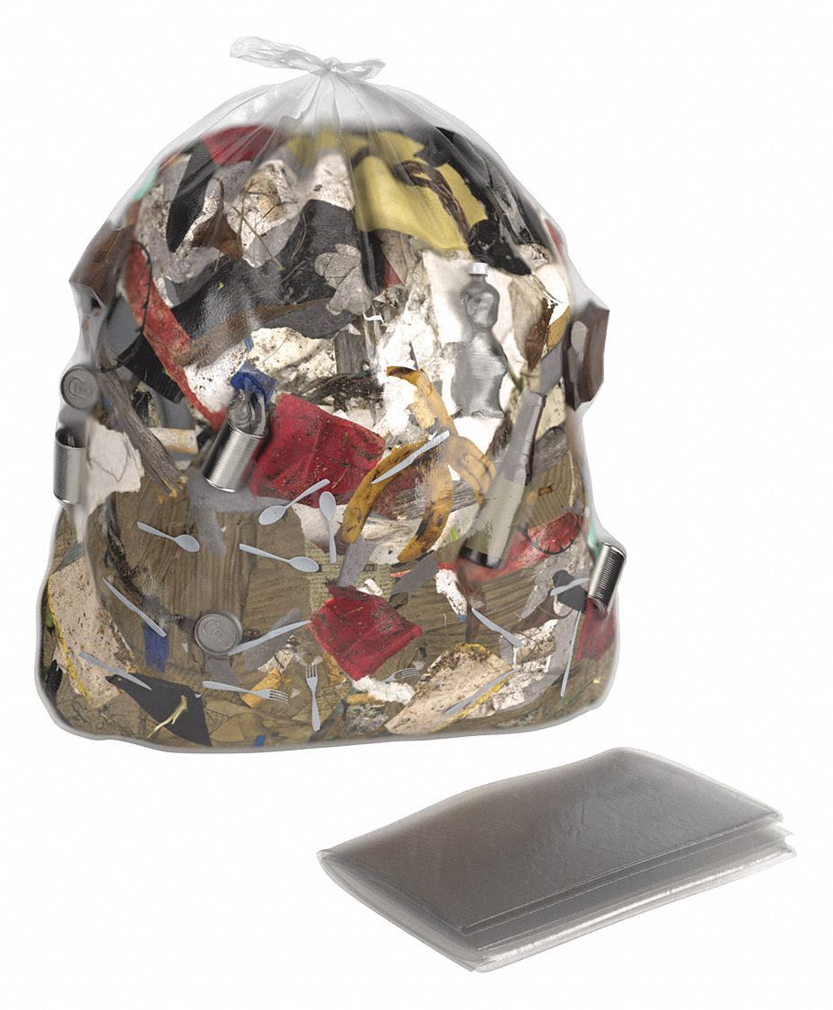 These trash bags are made from LLDPE (linear low-density polyethylene), which is a plastic that stretches to conform to waste and resists tears, impacts, and punctures. They hold discarded items that have sharp corners or edges, including glass shards, sticks, and broken-down cardboard. Brand: GRAINGER Bag Product Grouping: Trash Bag Capacity: 60 gal % Recycled Content: 0% Thickness: 4 mil Color: Clear Bag Closure Type: None Width: 38 in Height: 58 in Max. Load: 130 lb Bottom Seal Type: Flat Scent: Unscented Legend: No Legend Package Configuration: Flat Pack Application: Food Service; Heavy Duty; Hospital; Industrial; Landscaping Trash Bag Material: LLDPE Display Qty: 50 Display Sell UOM: PK.